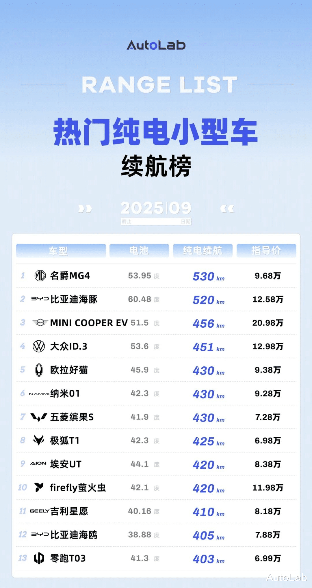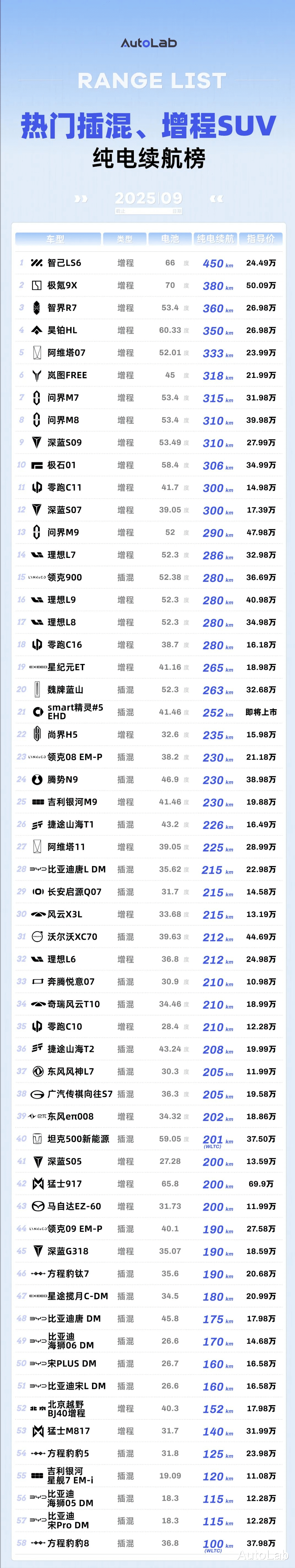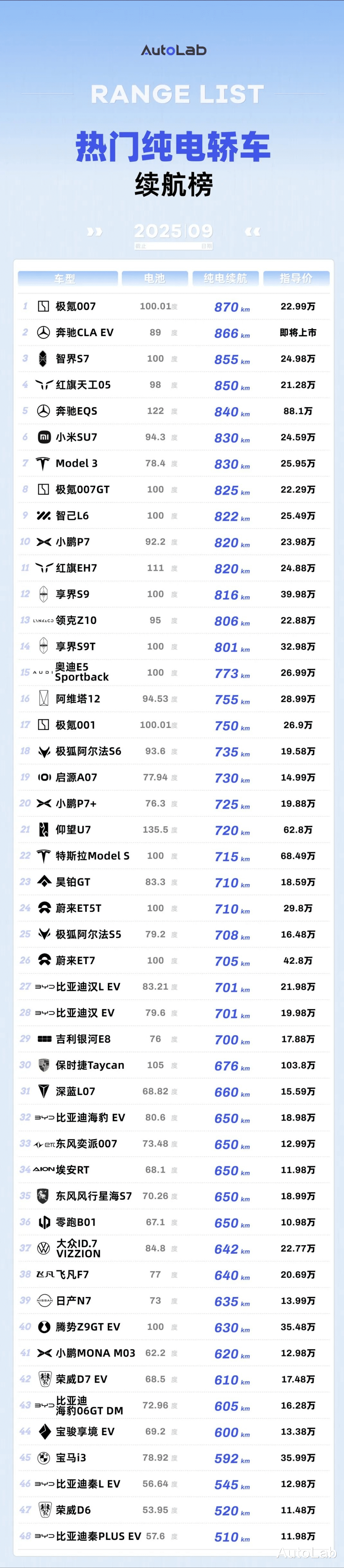 9月份的续航榜如期而至,首先还是声明一下,这个跟《LAB测试》前段时间的51车续航实测榜单不同。