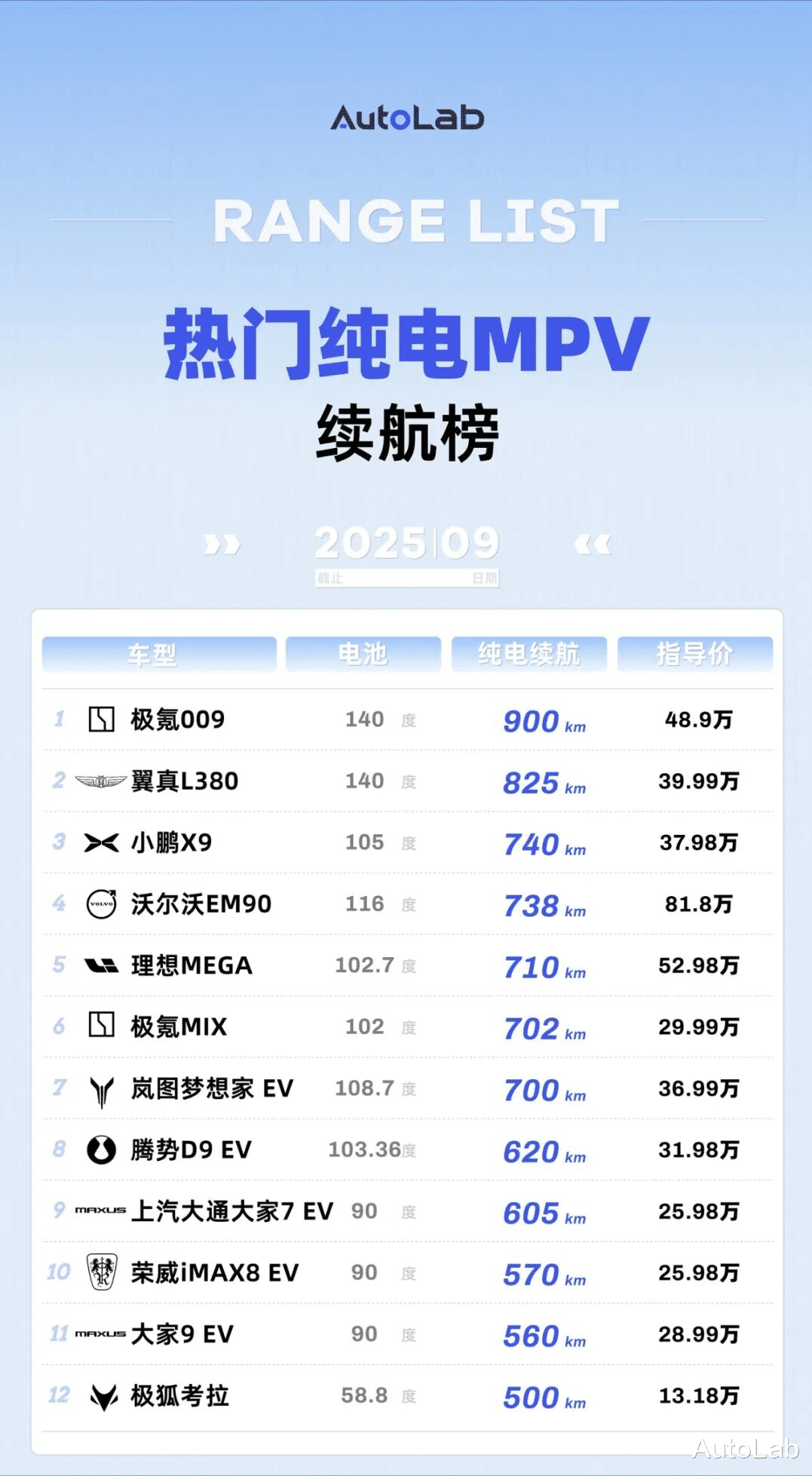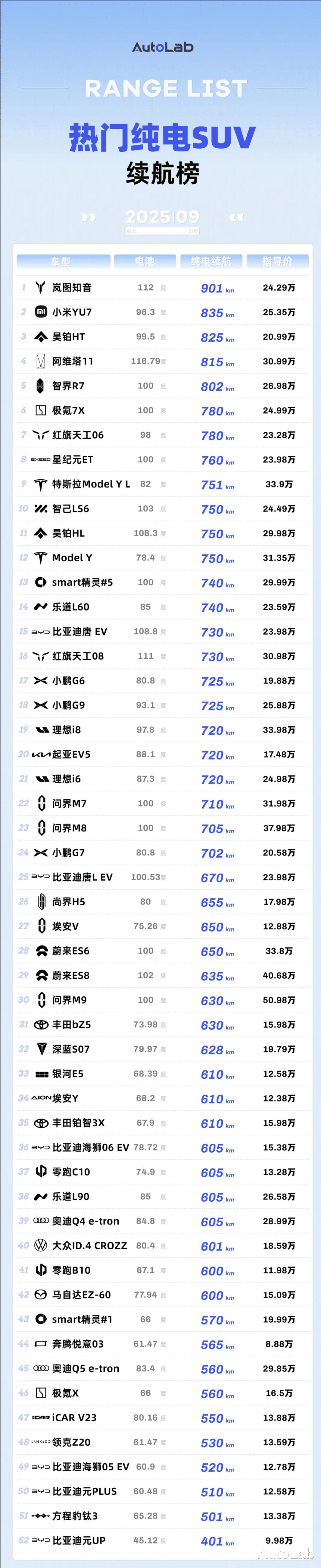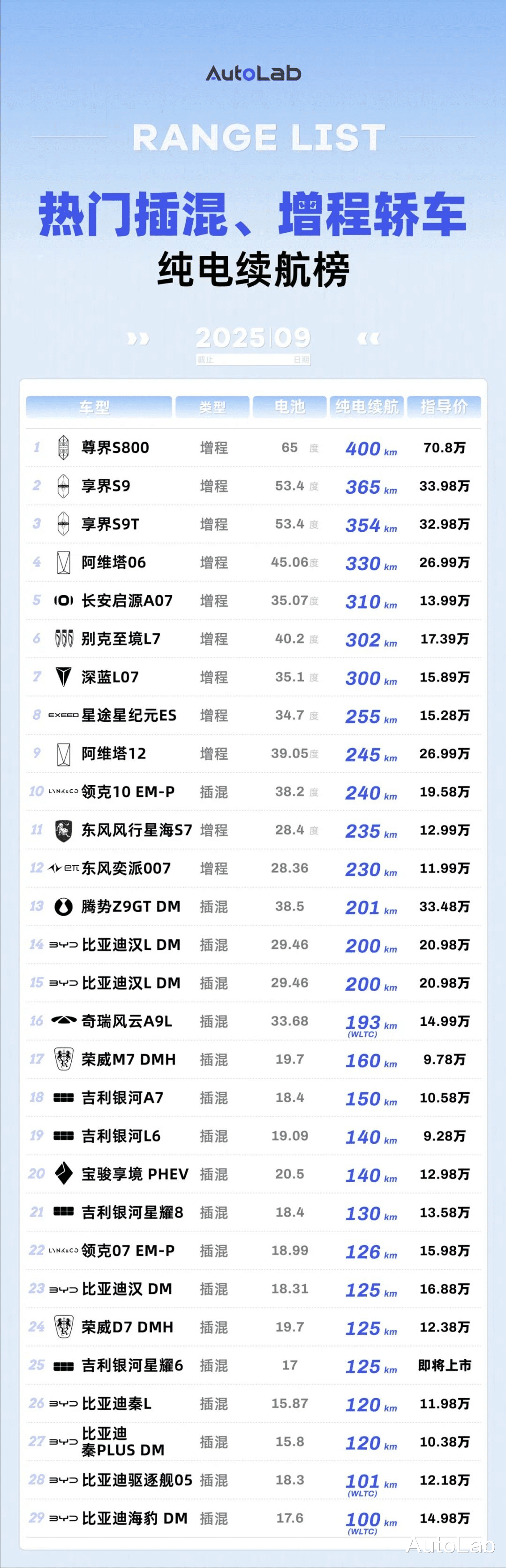 9月份的续航榜如期而至,首先还是声明一下,这个跟《LAB测试》前段时间的51车续航实测榜单不同。