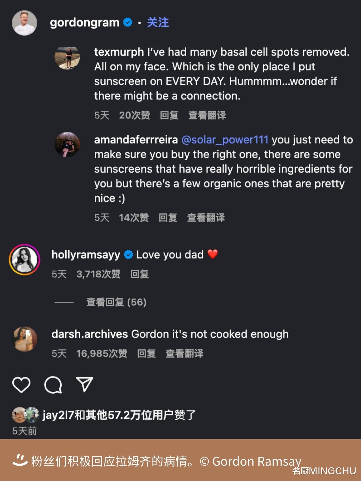 不仅是粉丝,朋友和家人也第一时间表达支持。一位厨师同行留言道:“很高兴你平安无事!祝你早日康复。”戈登·拉姆齐的女儿 Holly 也在评论中写道:“爸爸,我爱你。”