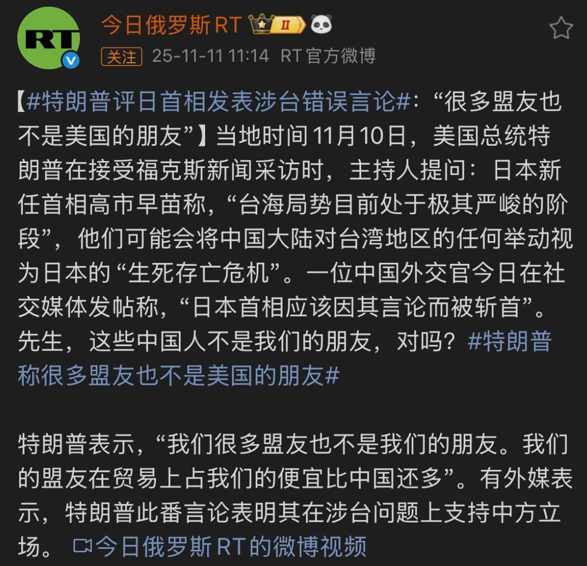 据观察者网11月12日报道,特朗普接受美国福克斯新闻采访时,主持人先是炒作渲染了一番所谓“中国军力扩张”,然后引出高市早苗发表的错误涉台言论,最后带着预设立场问特朗普:“中国不是美国的朋友,对吧”?