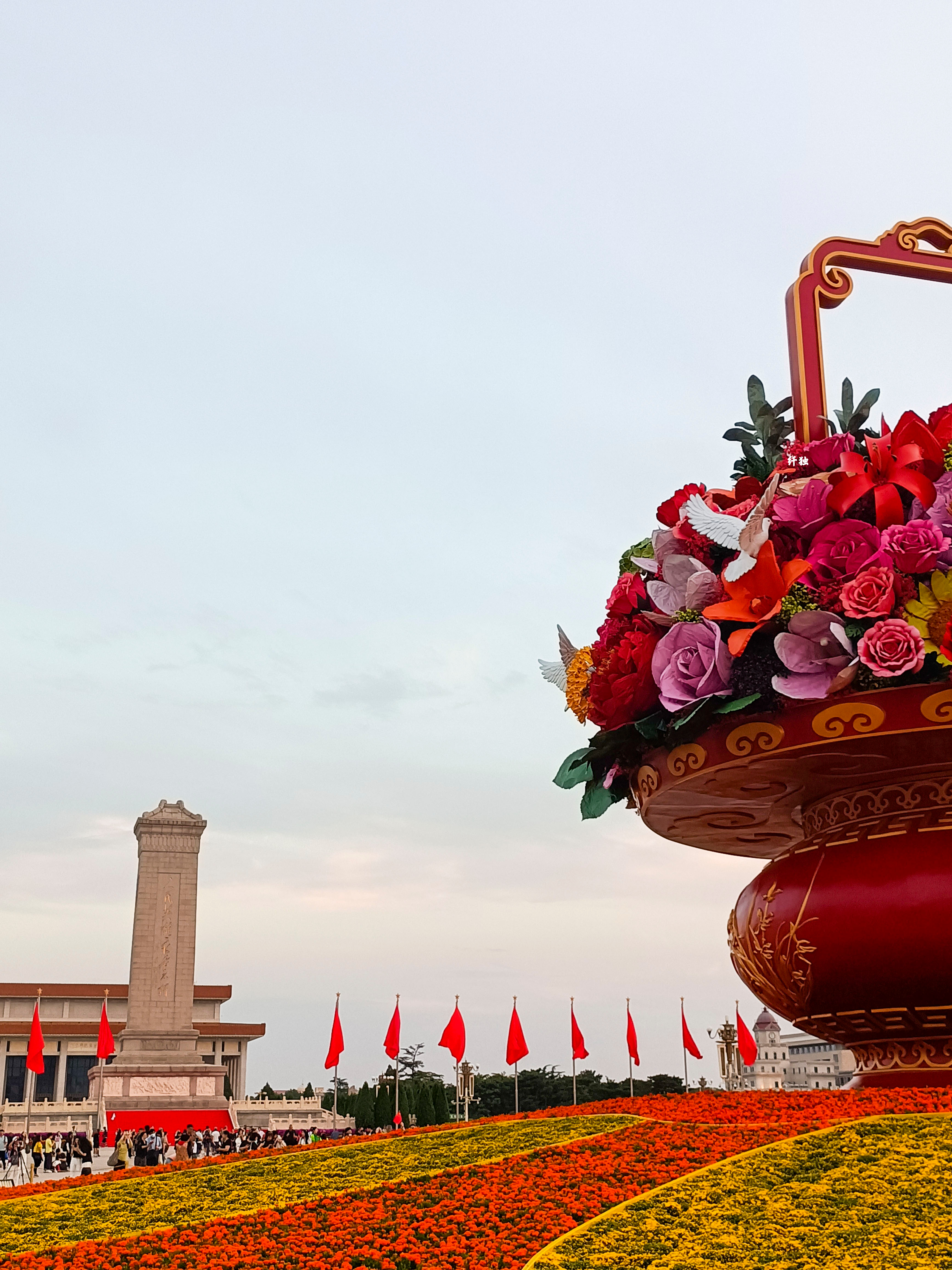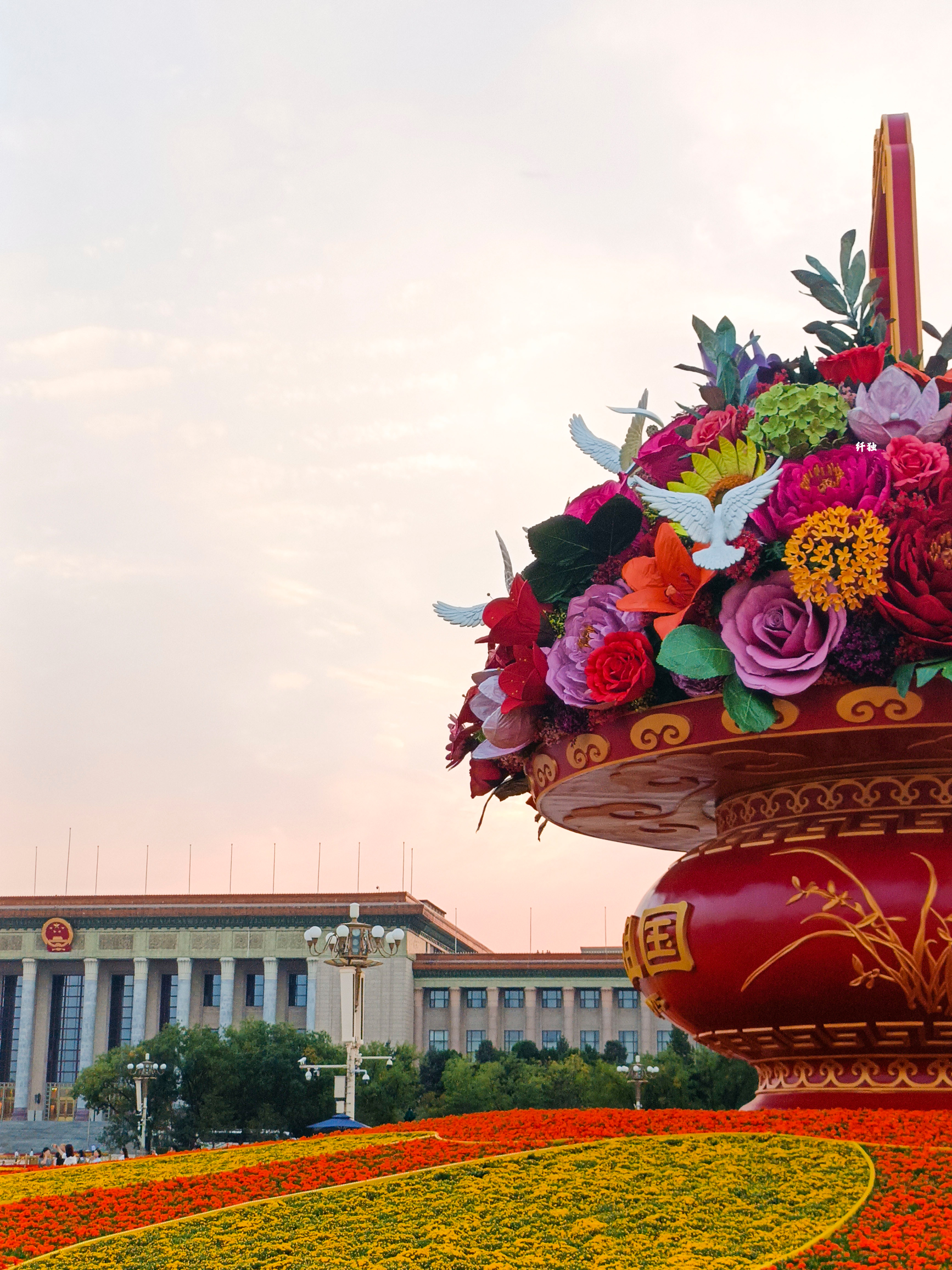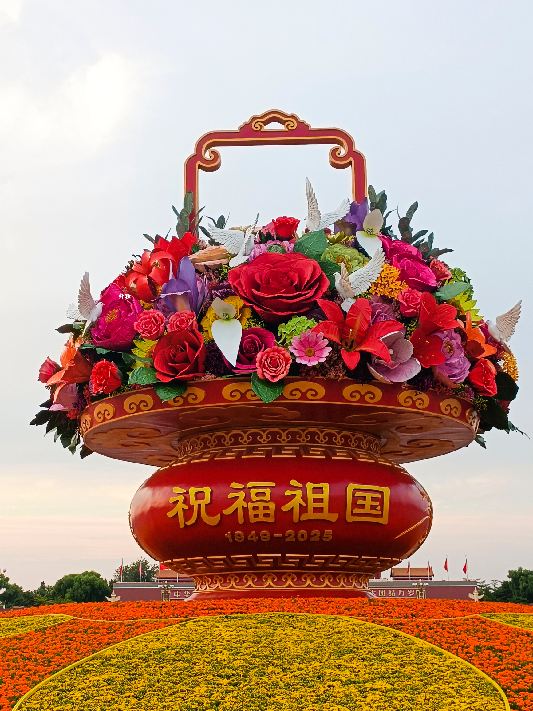天安门2025年的国庆大花篮花团锦簇,而且花朵和元素包含深意。