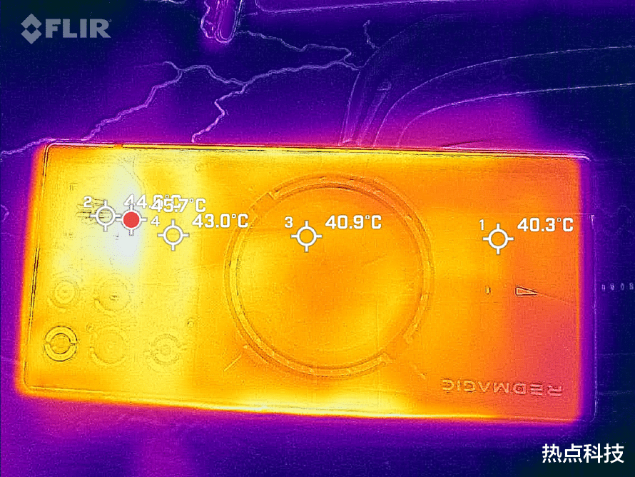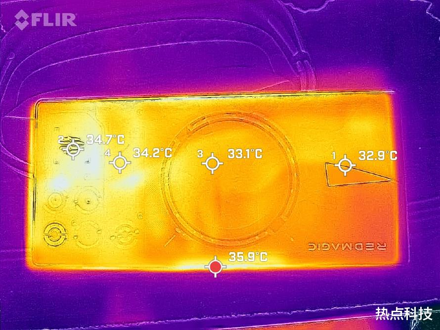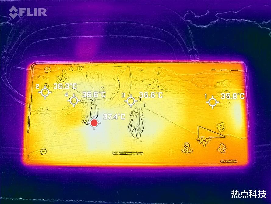 不过在《原神》这种相对低的负载下,手机性能要求没那么高的游戏场景下,红魔散热的温度优势就发挥出来了。30分钟《原神》游戏之后,红魔的正面屏幕最高温度37.4℃,背面最高温度35.9℃,主要握持区域温度基本控制在33℃左右。