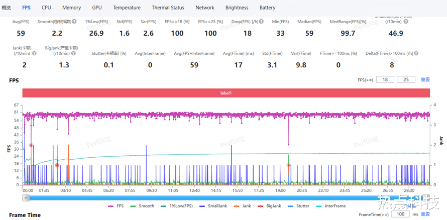手机的风冷与液冷分别提供了开关选项,不过在进入游戏之后,风冷与液冷会默认自动开启,开启手机性能的觉醒模式之后,开始本次游戏测试。30分钟游戏之后,游戏平均帧率达到60.9帧,1%Low帧为57.3帧,帧率的走势图可以说是稳如一条直线。