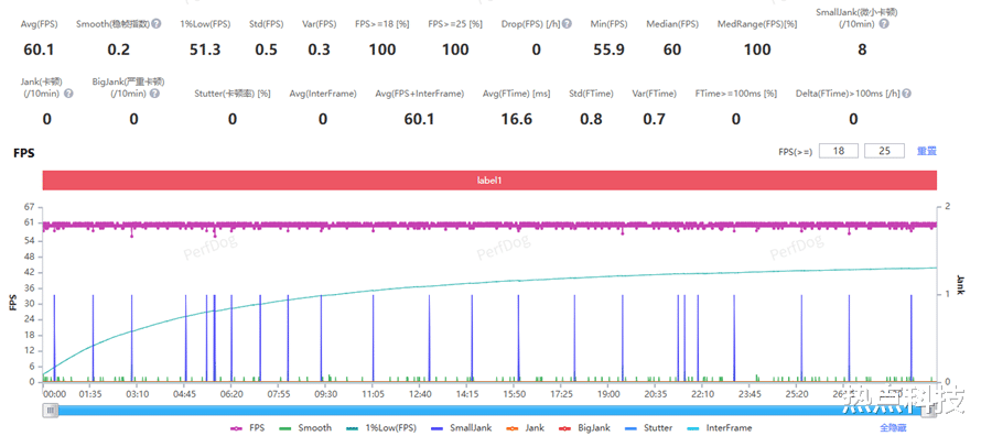 此时,红魔11 Pro+的平均游戏帧率为61帧,1%Low帧58.4,游戏帧率同样稳如一条直线,与开启液冷循环的游戏帧率差别并不大。