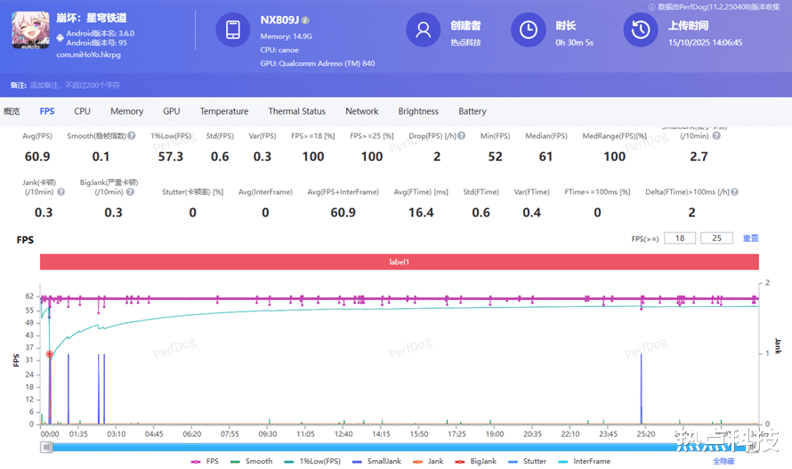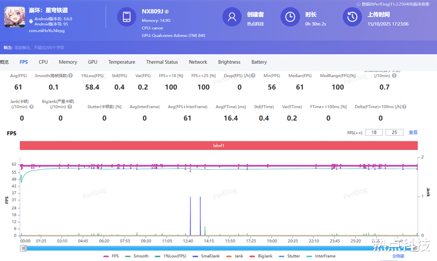 同样采用的第五代骁龙8至尊版芯片,另外1款手机《崩坏·星穹铁道》的平均游戏帧率为59帧,1%Low帧仅有26.9帧(数值越靠近最高帧率,游戏越流畅),而且游戏帧率的走势图有明显的波动,对比红魔11 Pro+的差异非常大。