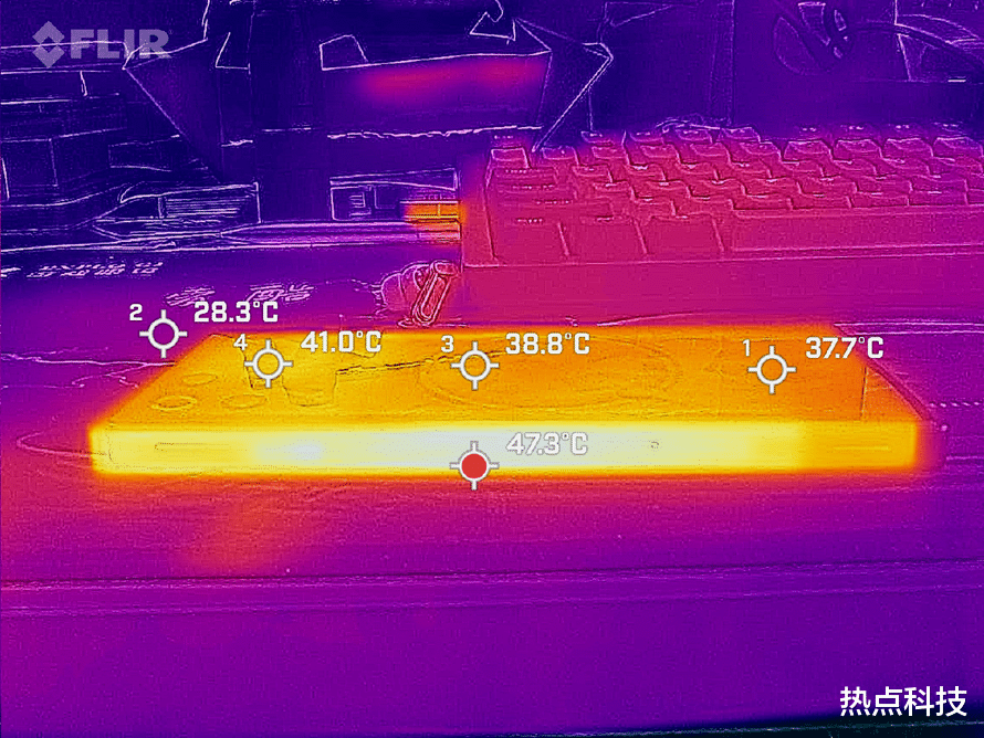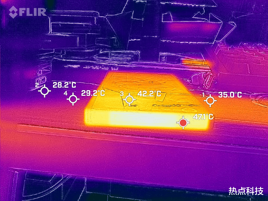 虽然红魔11 Pro+的背面温度不太高,但是手机四周的金属中框温度要更高一些,达到了47.3℃,可能是由于水冷以及手机内部散热通过金属中框向外散热,再加上金属的高导热特性。