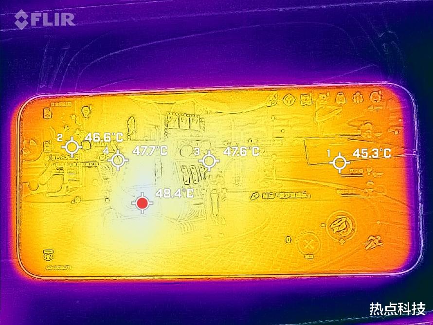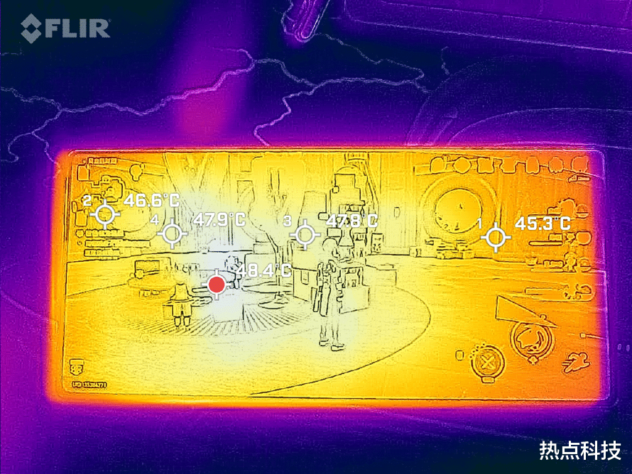 对比,另外1款搭载第五代骁龙8至尊版手机的温度也不低,正面的最高温度达到了48.4℃,背面最高温度也达到了45.5℃,与红魔11 Pro+的温度不分上下。而且手机下半部分区域温度达到43℃,比红魔11 Pro+高不少。