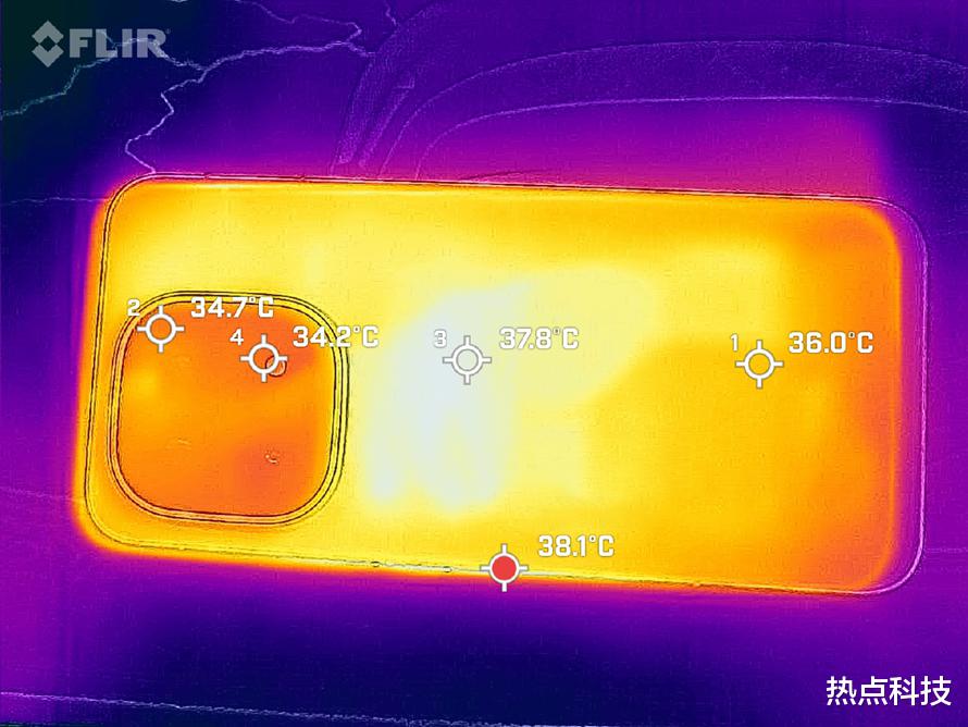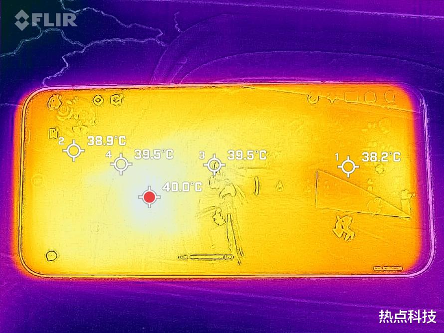 作为对比的另外一款同样芯片手机,正面最高温度40℃,背面最高温度38.1℃。如此对比来看,红魔11 Pro+的温度要低不少。