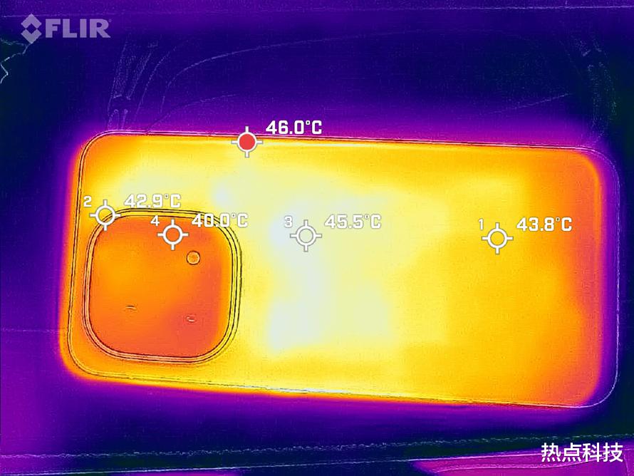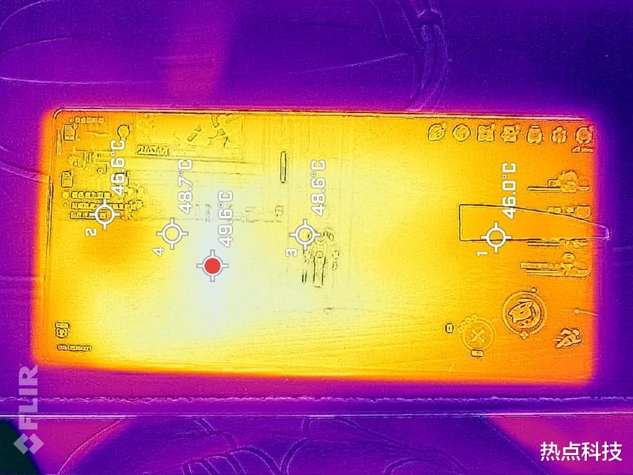 30分钟游戏之后,我们也使用红外测温仪分别测量了两款手机的温度。其中帧率高且稳得红魔11 Pro手机正面最高温度达到了48.4℃,背面最高温度45.7℃位于后摄模组右侧,但是从测温图中,可以看出有着水冷覆盖的机身下半区域温度比较低且均匀,控制在40℃左右。