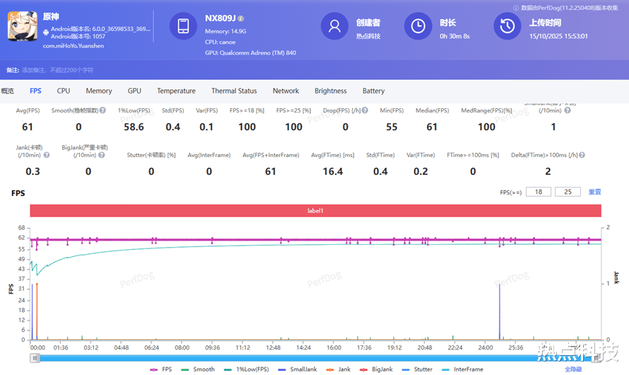 在《原神》游戏测试中,开启最高画质+60帧模式下,红魔11 Pro+的平均游戏帧率稳在61帧,1%Low帧58.6。