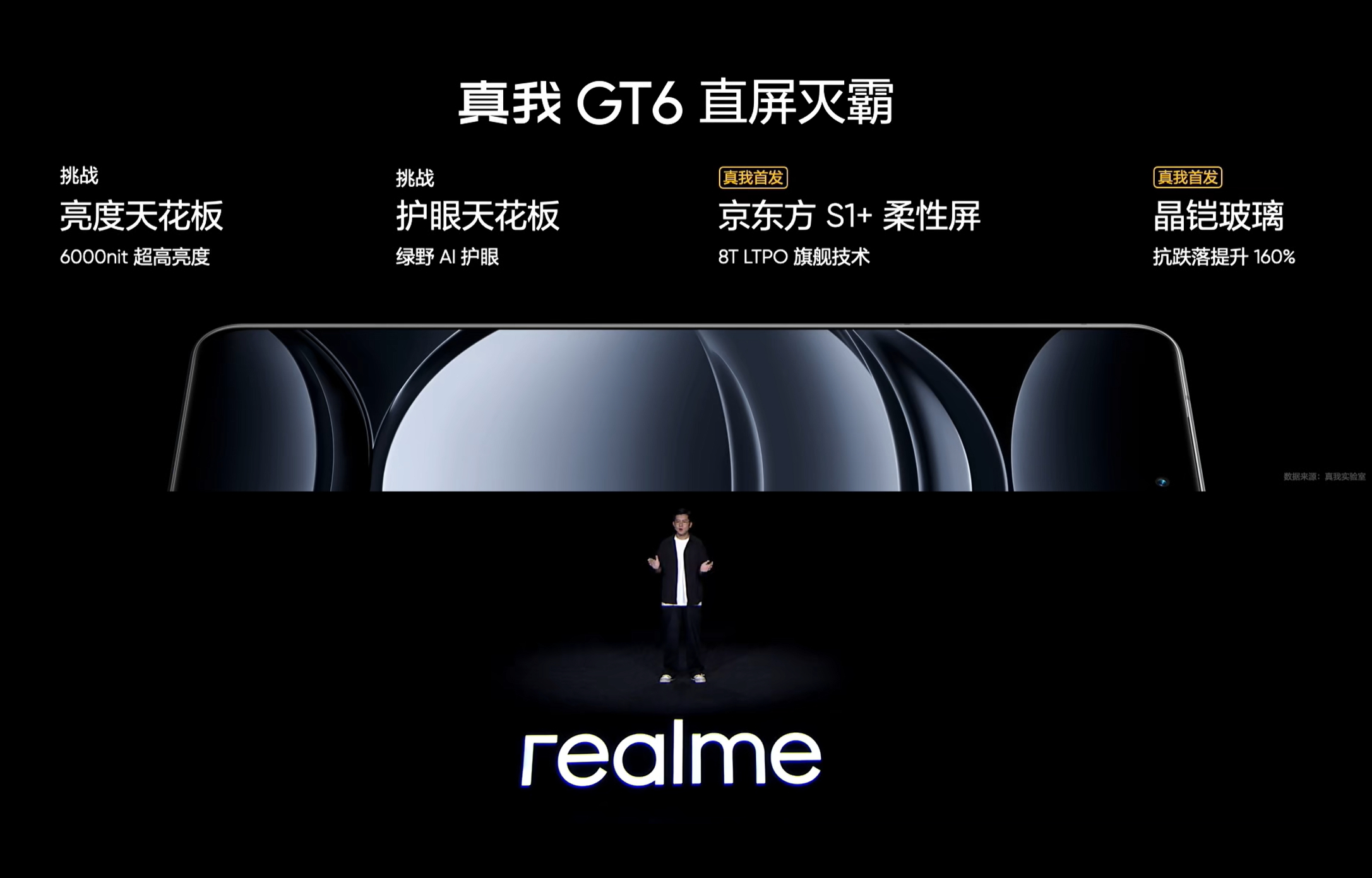 相比于上一代GT5,真我GT6可以说是全方位升级了,不仅换上了骁龙8 Gen3处理器,在屏幕方面还首发采用京东方S1+电竞直屏,支持8T LTPO自适应高刷和6000nit超高亮度,这屏幕拿来玩游戏简直不要太爽了。