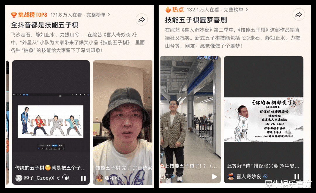 这些天在屠榜抖音热点的 #全抖音都是技能五子棋# 、 #技能五子棋噩梦喜剧# 等爆点话题下,犀牛君看到有模仿洗脑舞蹈和金句台词“精神状态美丽”的,有“痛诉”被技能五子棋之歌洗脑三天连做梦里都不消停的,有程序员干脆“发挥专长”做了好几版《技能五子棋》游戏的,当然,也有吃不惯这款“喜剧香菜”直呼看不懂这世界的“正常人”的……