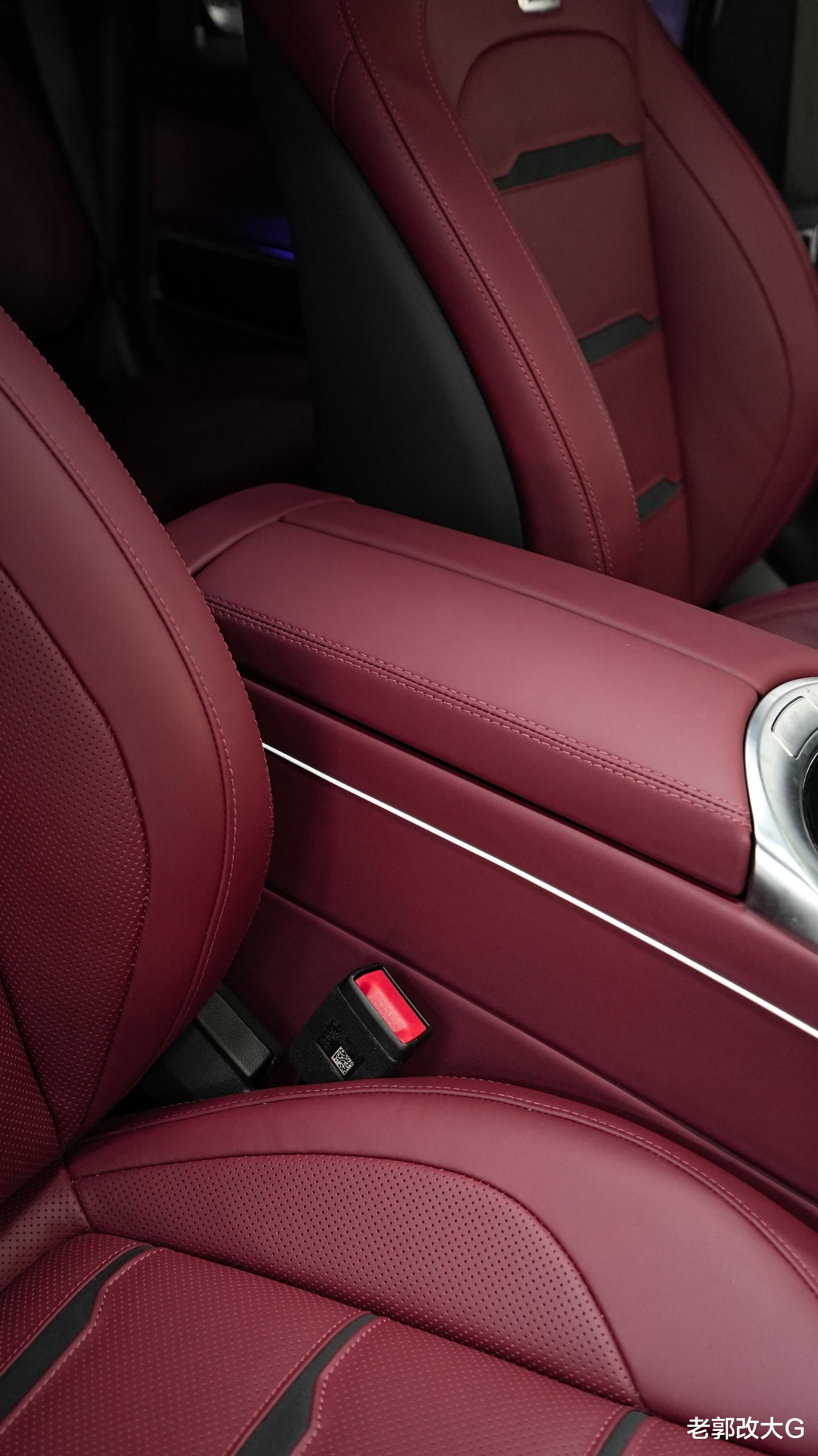 这与车内其他部位的黑色真皮形成了经典的红黑配色,运动感与奢华感并存。每一处缝线都精准细腻,每一个菱格纹压花都均匀饱满,彰显出非凡的改装工艺。