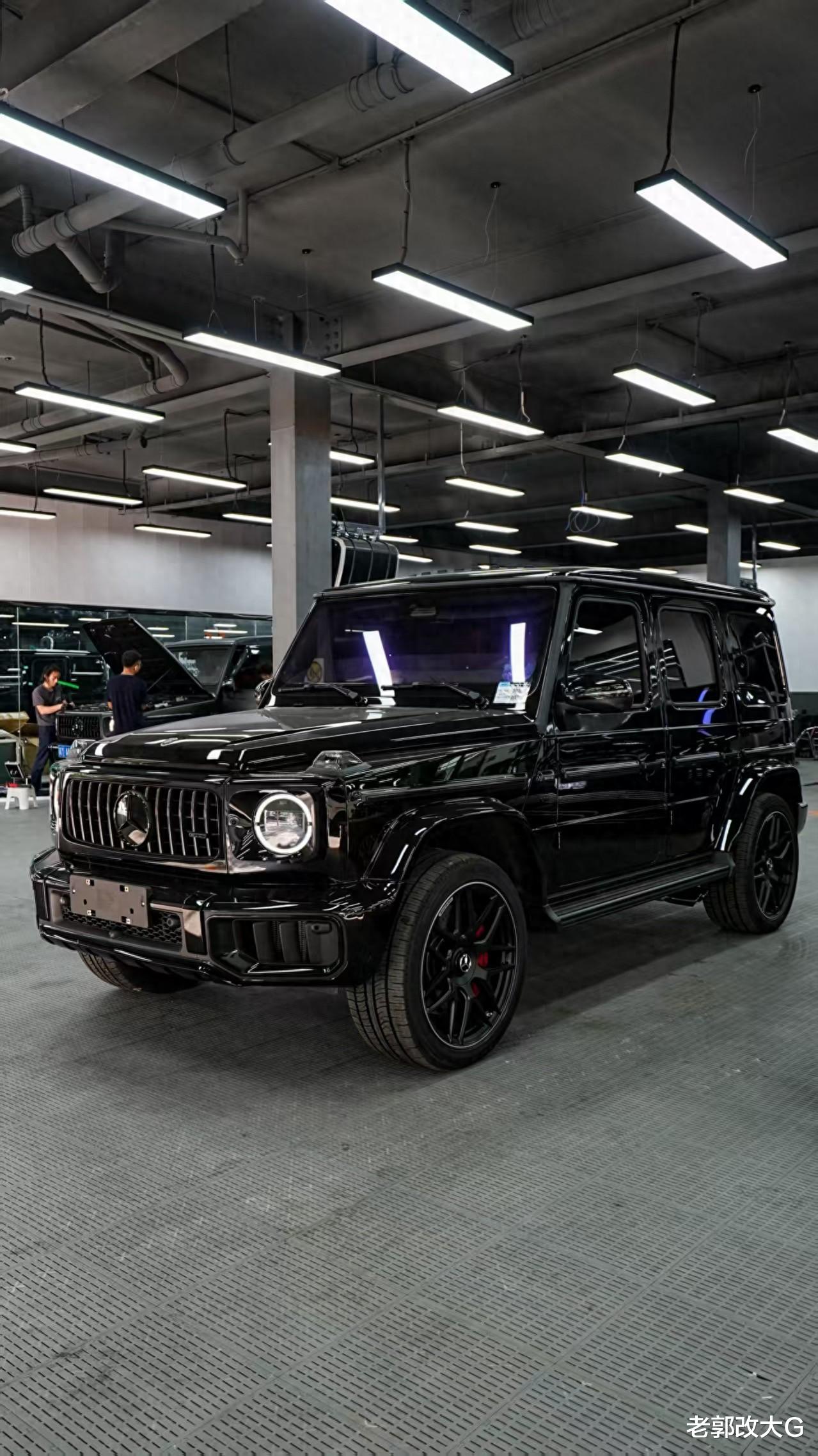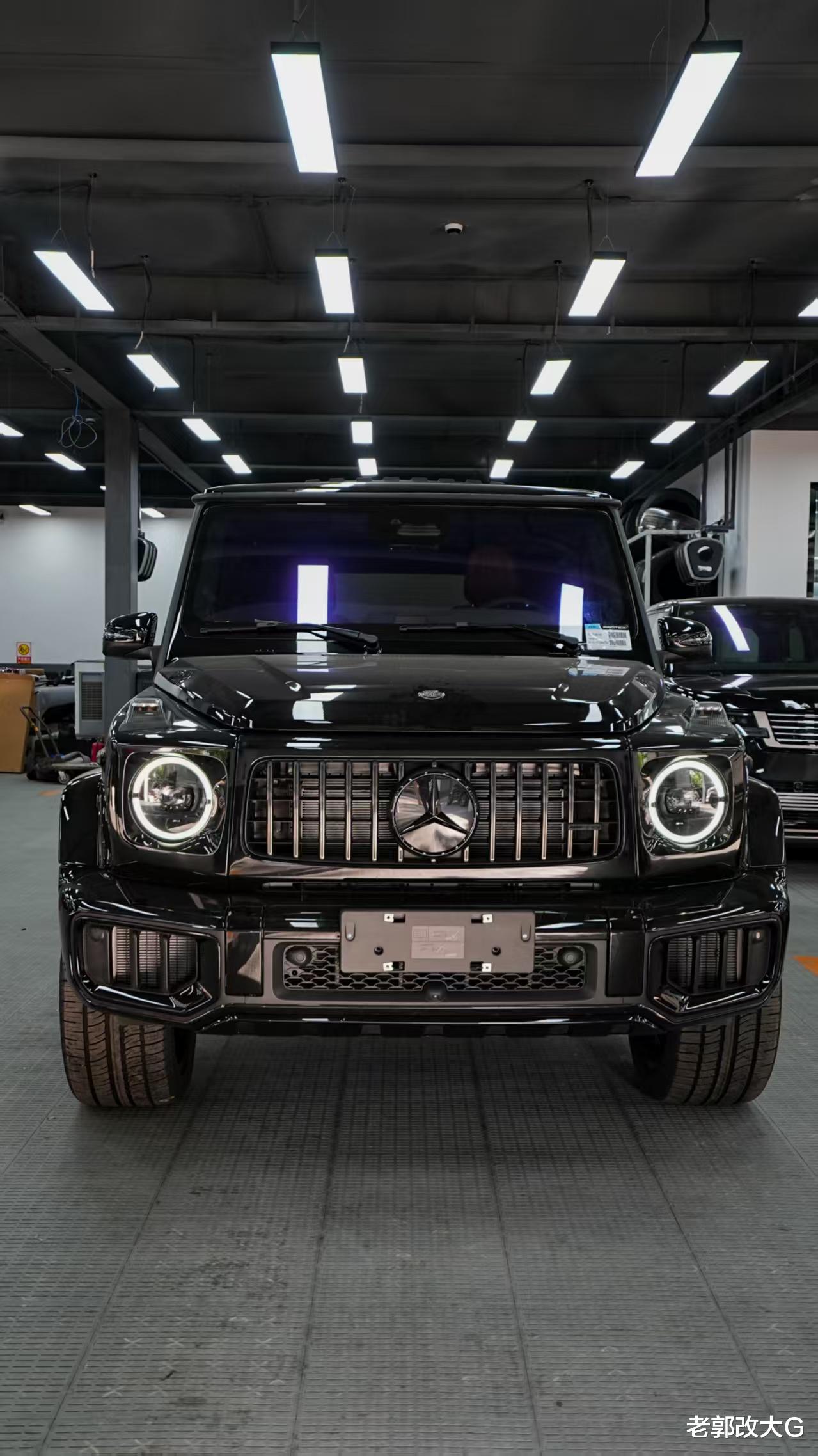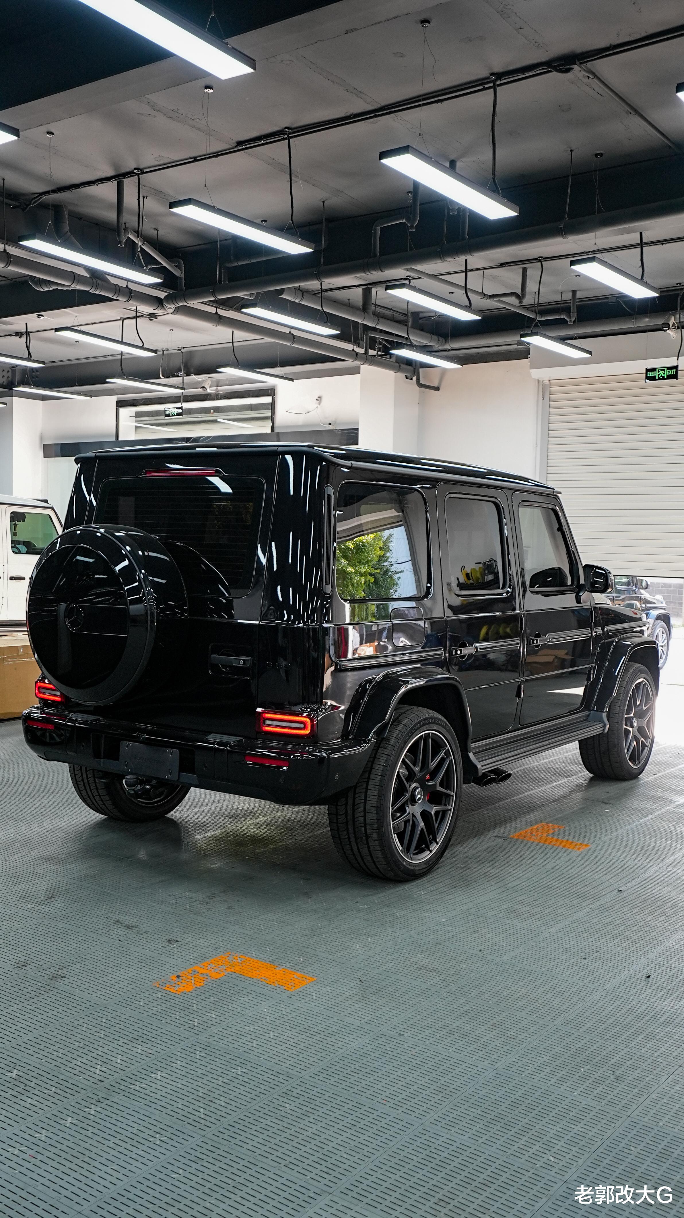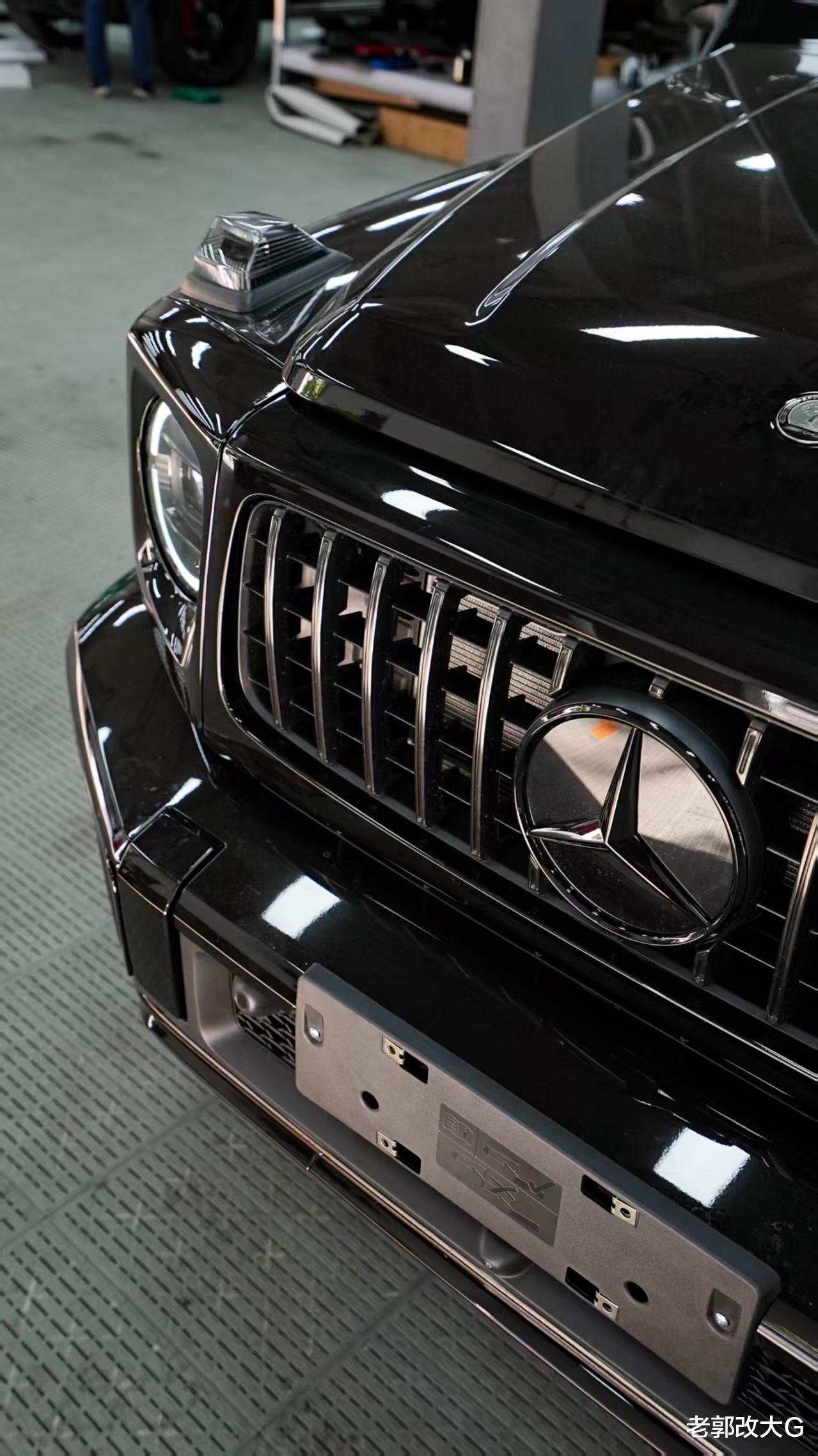 同时,暗夜灯光包 将头灯、尾灯进行熏黑处理,让这台G63的目光变得更加深邃和神秘。再换上一面纯黑的暗夜中网,并搭配黑色的三叉星徽与“G63”字标,至此,一位身披暗夜铠甲的暗黑武士已初具雏形。