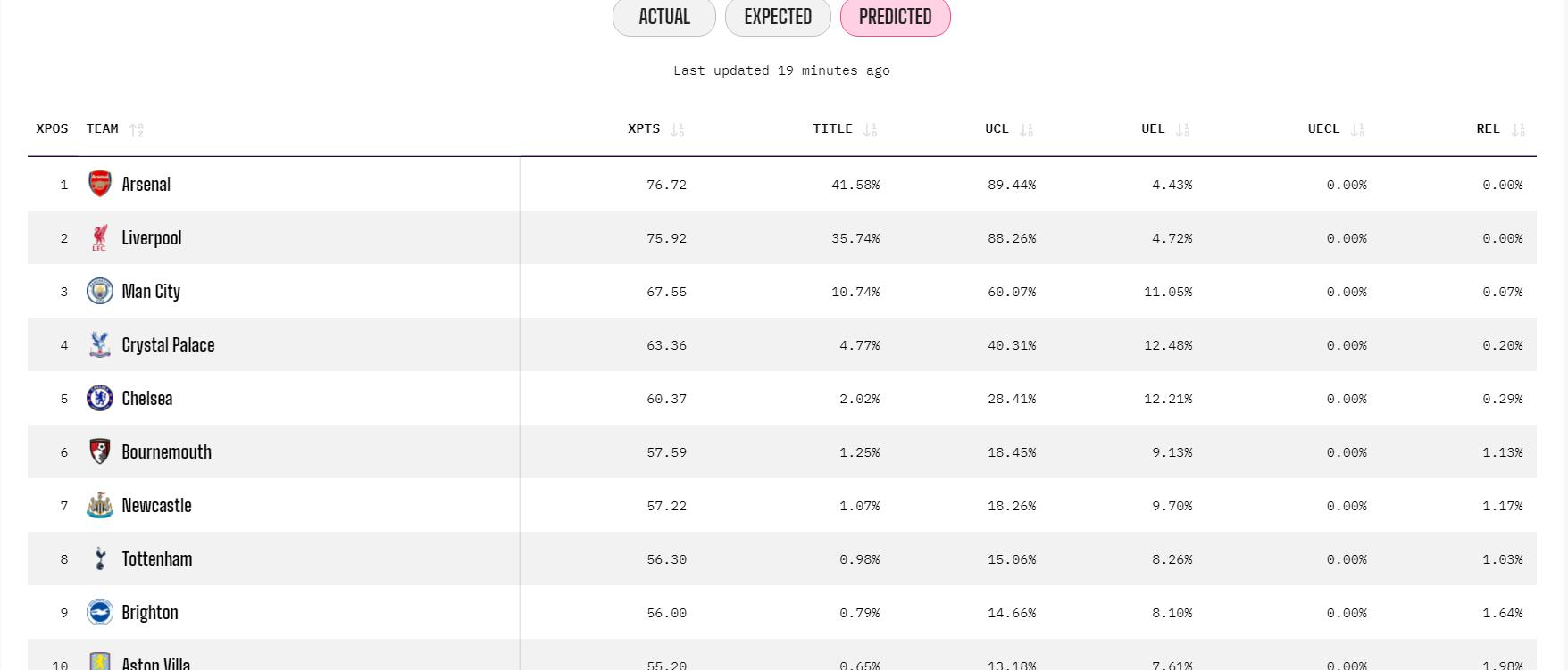 随着英超第7轮前5场比赛的结束,Opta也对于争冠形势做出了最新的预测--目前领先利物浦1分而暂居英超榜首的阿森纳,也凭借41.58%的概率超越利物浦成为了最新的夺冠大热。