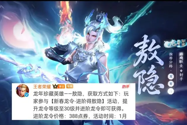 总之,新春龙令活动是《王者荣耀》为了庆祝龙年而推出的一项超值回馈,新英雄敖隐是一位龙年限定的英雄,拥有独特的技能机制和精美的形象设计,是值得玩家们收藏的一位英雄。