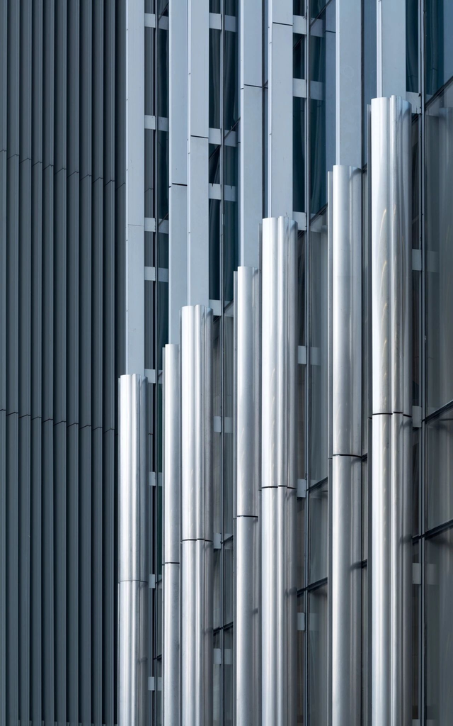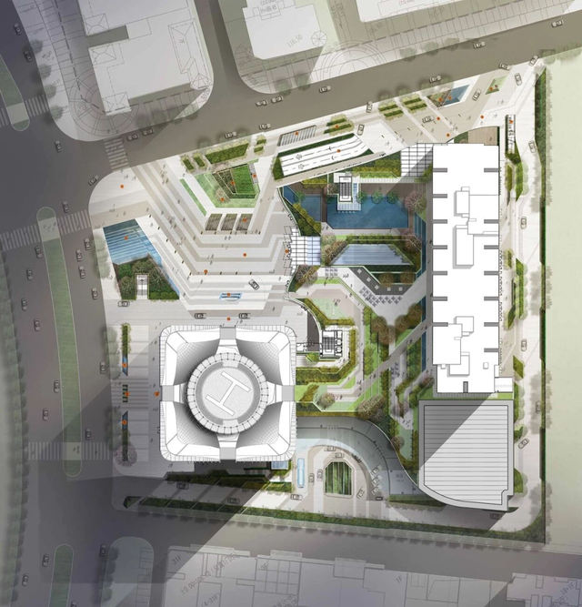 项目西北侧设有一处入口广场,地面铺装的纹理呼应塔楼的倒影,与树池、光影共同勾勒出丰富的层次。西侧的主塔在周边楼群中开辟出一条以它为中心的视觉廊道,强化了其地标地位。