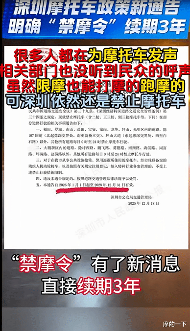 近年来,越来越多有名人士,普通市民、骑手和摩托车爱好者为摩托车出行发声:它灵活、经济、适合短途接驳,尤其在交通拥堵的城市边缘区域,是公交与网约车之外的重要补充。一些城市已尝试在安全前提下开放“合规网约摩的”,允许持证骑手在指定区域提供服务。然而,在深圳这座超一线城市,摩托车依然被全面禁止上路,而且是再续三年。