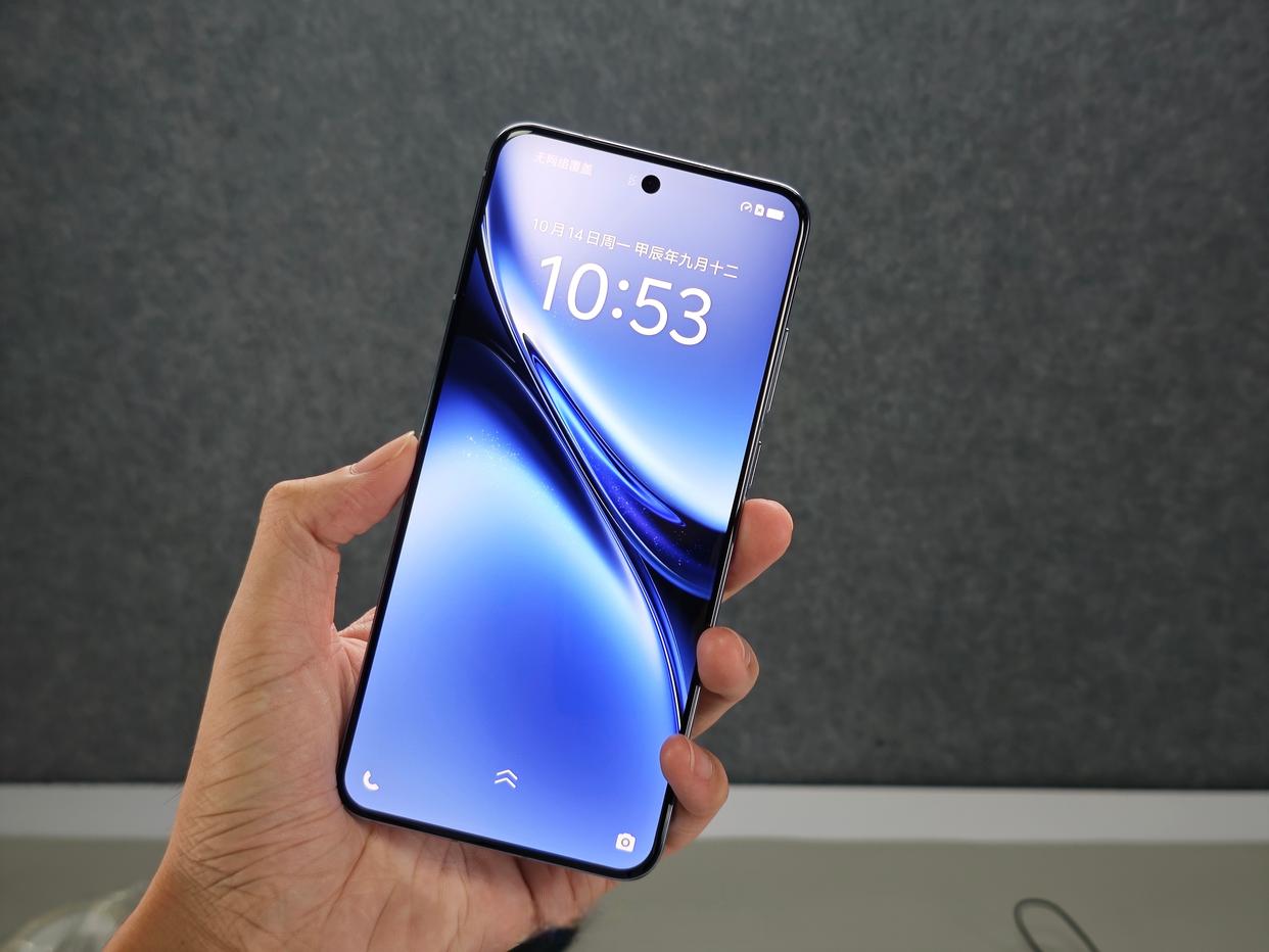 150.83mm×71.76mm的机身仅两个粉饼盒大小,8.15mm厚度与187g重量,单手操控时掌心贴合度高。微粉、钛青等配色采用AG磨砂玻璃背板,既防指纹又显质感,但有用户提到“钛青实际色调比宣传图更沉稳,适合日常搭配”。直屏窄边框设计带来接近四边等宽的视觉效果,不过屏下指纹位置偏下,部分手小用户需调整握持姿势才能解锁,好在2169Hz高频PWM调光屏幕兼顾了护眼与显示效果。