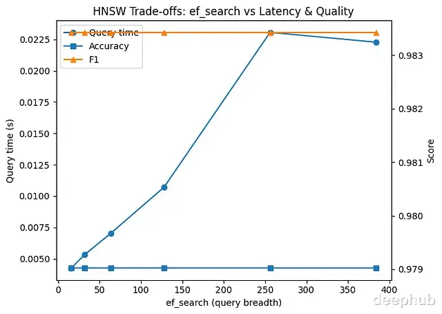 交叉验证反复选中了小搜索广度(ef_search=32)配合适中连接度(M=12)和k=5。参数扫描显示,把ef_search从16推到384,准确率几乎不动,延迟却线性增长。这是因为,一旦定位到正确区域,翻4倍的候选集并不能在这个数据上找到更好的邻居,纯粹是浪费时间。