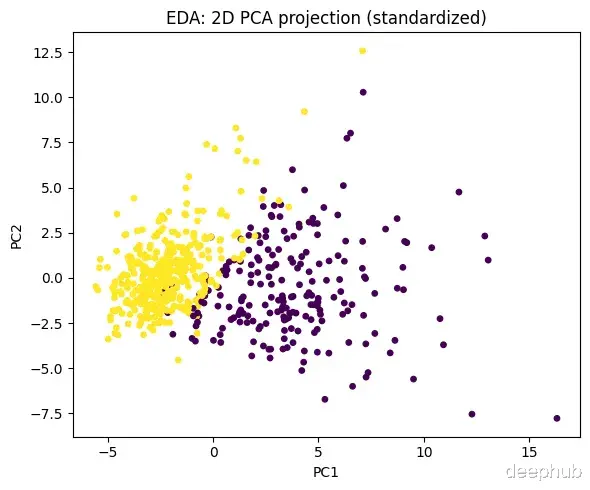 代码实现详解这个脚本演示了如何用HNSW替代UCI乳腺癌数据集上的暴力k-NN。完整流程包括:加载数据,用2D PCA做快速EDA揭示聚类结构,标准化特征,可选地应用PCA生成紧凑嵌入(基于距离的方法对尺度很敏感)。