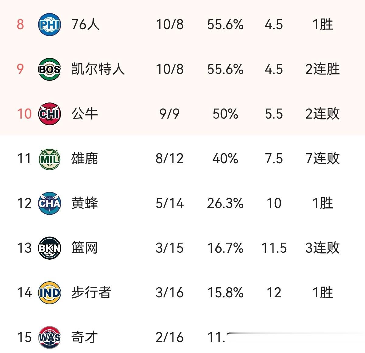 2.雄鹿遭遇7连败,奇才垫底。今日76人115-103击败篮网,马克西得到22+9+7,格兰姆斯19+3+9,乔治14+3+2;赛后76人和凯尔特人战绩都是10胜8负,分列东部第8-9名。公牛116-123不敌黄蜂,吉迪空砍准三双25+11+9,怀特25分,武切维奇13分14篮板,赛后9胜9负的公牛占据附加赛区最后一个名额。第11名雄鹿109-118不敌尼克斯,遭遇7连败,字母哥复出空砍30+15+8。黄蜂123-116击败公牛,三人得分20+,布里奇斯22+8+7,米勒27分5篮板,塞克斯顿21分,鲍尔贡献16+7+8。后三名分别为篮网、步行者、奇才,今日篮网103-117不敌76人,遭遇3连败;步行者119-86大胜奇才,使得奇才沦为垫底。