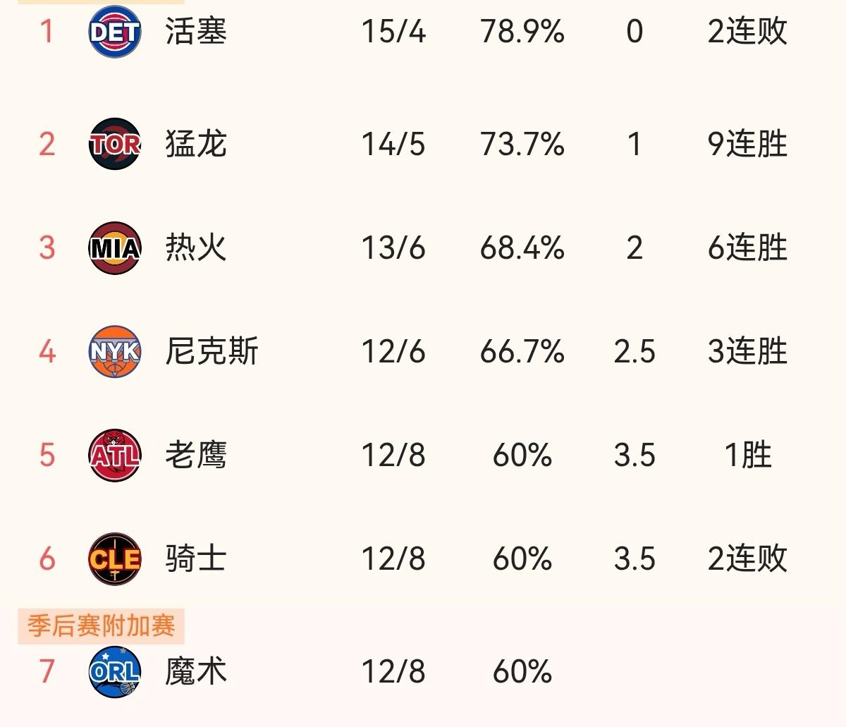 2025-2026赛季NBA常规赛正在如火如荼的进行中,11月29日比赛结束后,东部排名榜彻底大乱:活塞遭遇2连败,苦守榜首却无缘杯赛;猛龙9连胜,成最大黑马;魔术挣扎在附加赛区,今日却以下克上击败榜首活塞;热火6连胜卡外晋级,成为杯赛幸运儿。