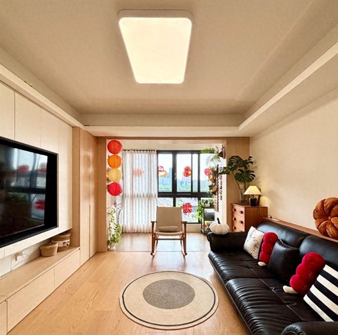 但和普通这类电视柜的做法不同,电视旁边特意留出了三层开放式书架,放平时自己喜欢看的小说和孩子的绘本,虽说看起来没那么简洁,但反而为客厅增添了几分生活气息。