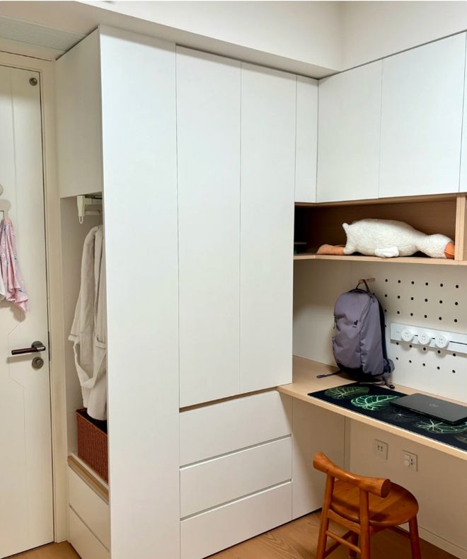最后就是书房里连接书桌的这组衣柜啦,其实说起来,家里三组衣柜都不大,但平均下来三口人一人用一组也完全足够。
