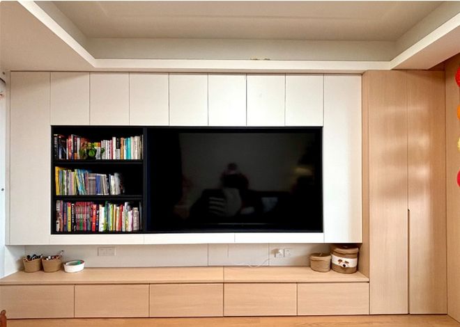 家里的客厅开间还算不错,干脆就做成了同样白色和木色经典搭配的满墙电视柜。