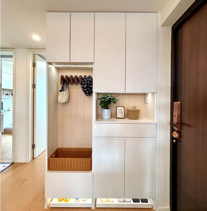 看似复杂,但每一个空间都有其作用——吊柜放不常拿的备用品,次净衣区方便收纳每天脱下的外套,置物台随手放钥匙钱包等物,抽屉层利用柜子深度收纳些零散杂物,鞋柜+底部抽屉方便每日拖鞋收纳,这么想想,是不是特别合理?