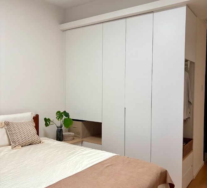 主卧室做的这组大衣柜,直接连接床头柜进行布置,侧边掏空了一个柜格,不影响柜面置物空间,同时也能让床边有足够的过道宽度,不影响柜门开合。