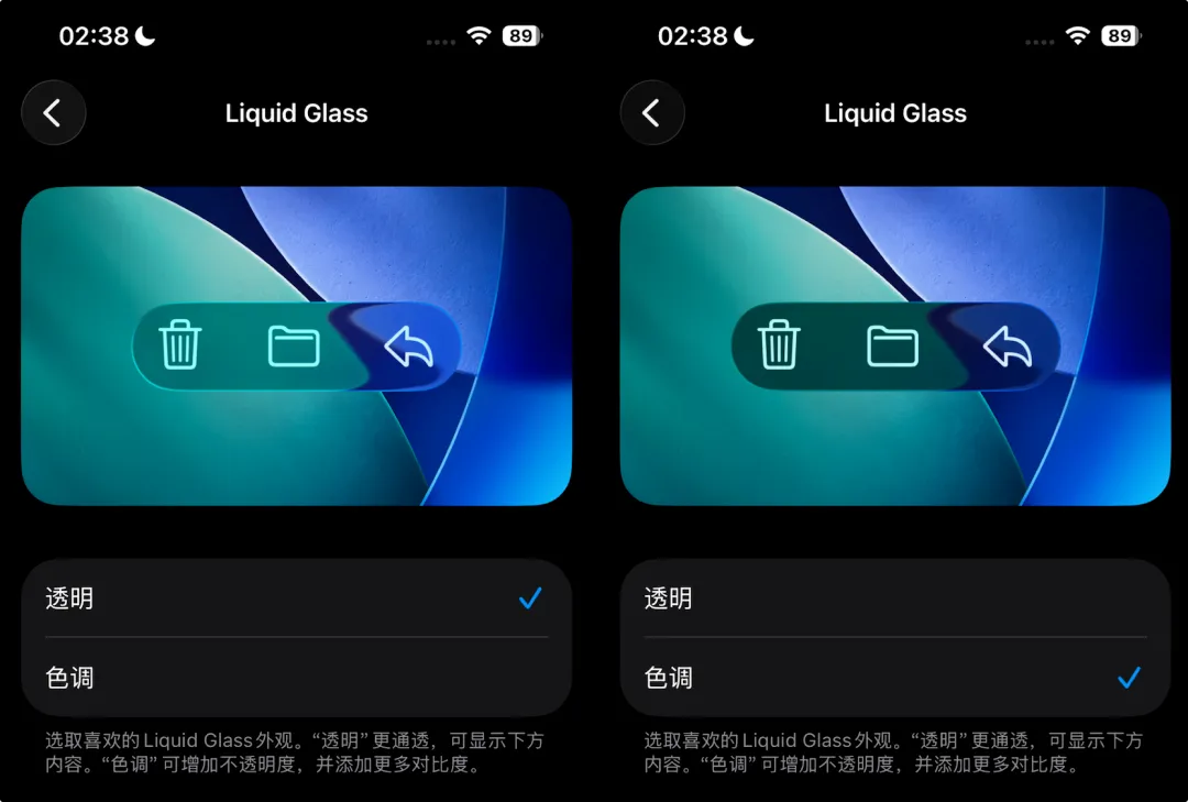 现在你可以在“透明”和“色调”两种风格之间切换。选“透明”就是保留原来的液态玻璃效果,界面看起来通透有层次;