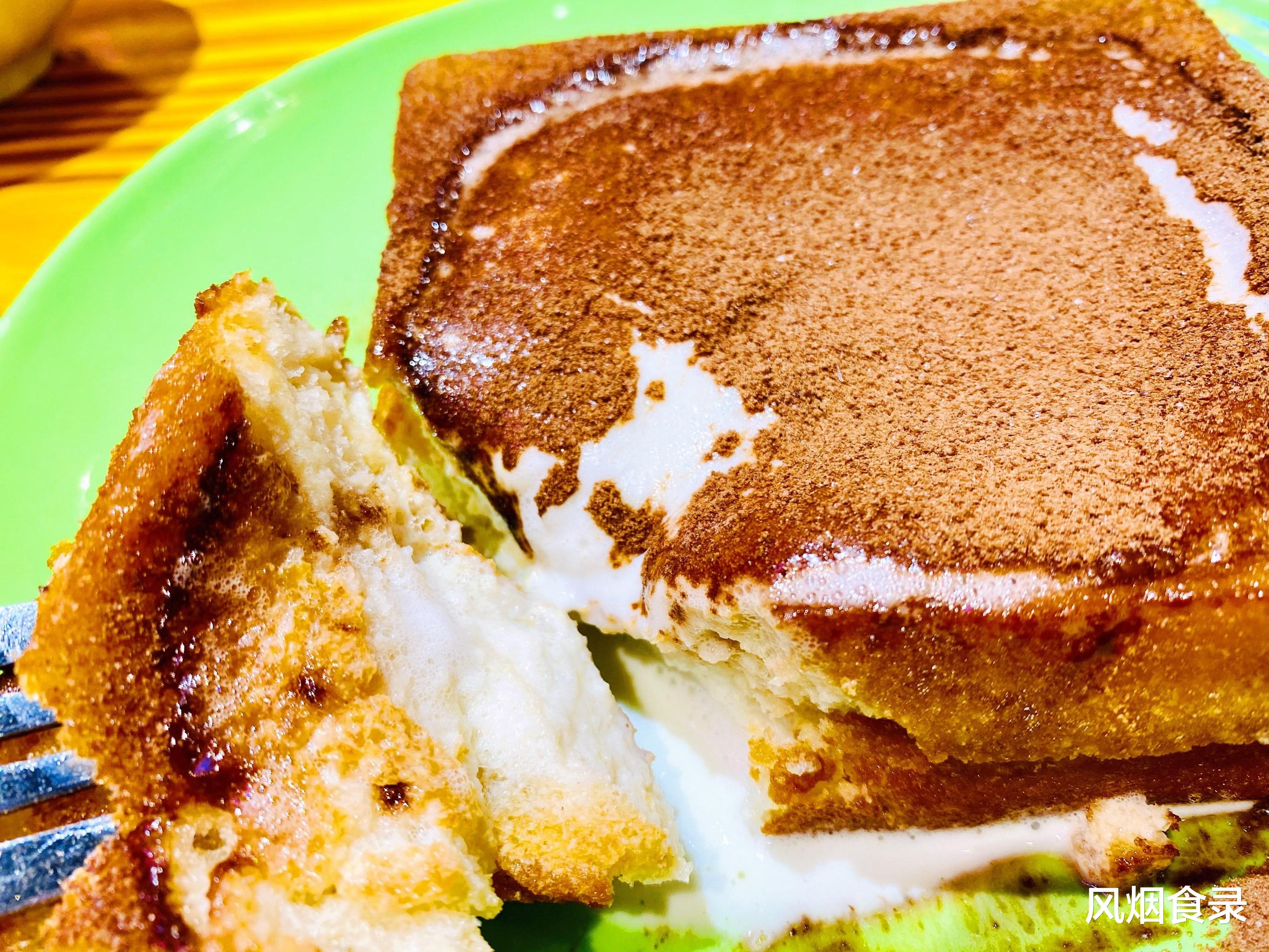吐司泡蛋奶、煎锅泡黄油、顶凹泡炼奶,最后撒粉像盖“黄金甲”。