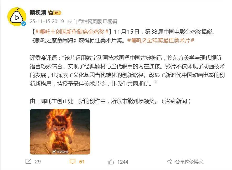 更耐人寻味的是,直到颁奖礼结束第二天,《哪吒2》官方账号依旧对获奖一事只字未提,既没发庆祝文案,也没回应缺席原因。要知道这部电影可是以154亿票房登顶中国影史冠军,打破113项纪录,全球总票房突破159亿,这样的 “顶流之作”,对待金鸡奖却冷淡到像 “查无此事”,难免让人浮想联翩。