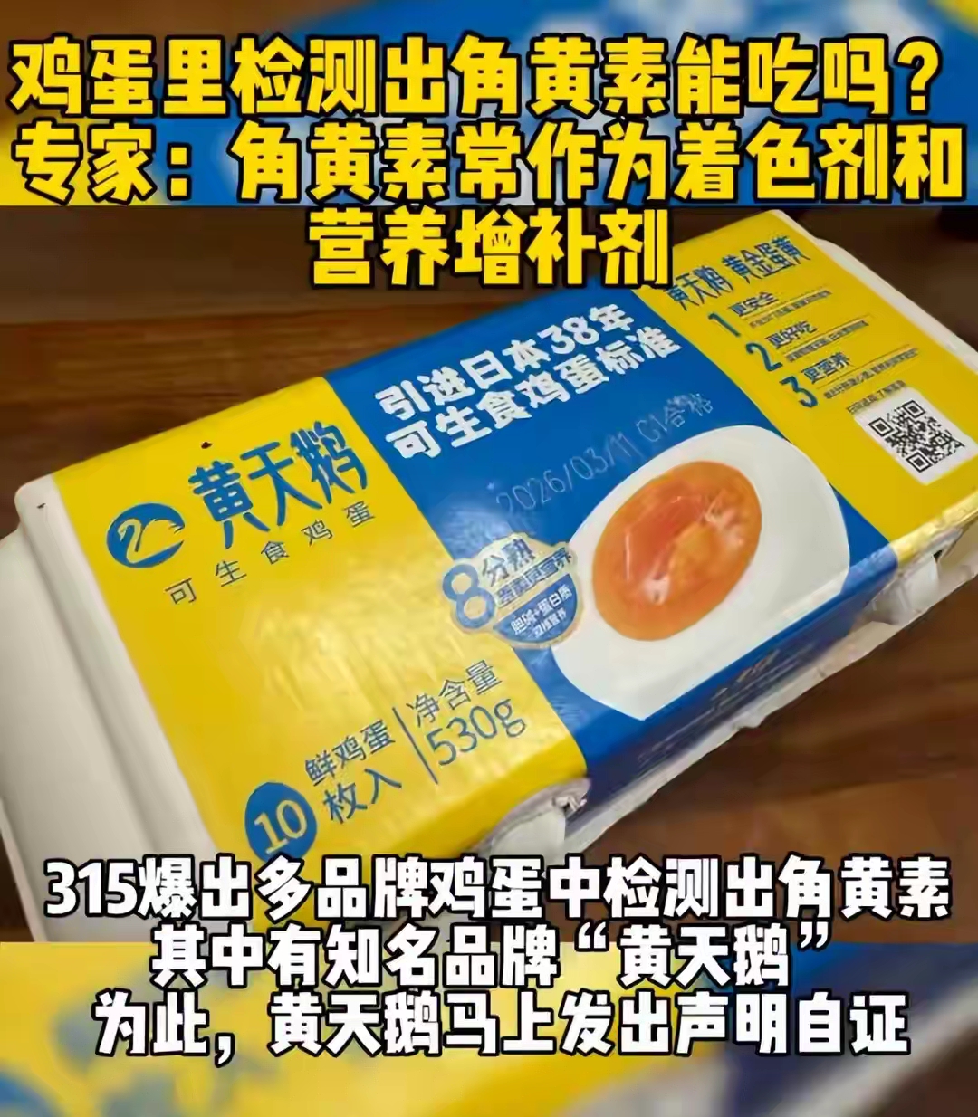 角黄素是合法饲料添加剂,用来让蛋黄更好看,国际上大多不设蛋中残留限,正常吃远达不到危害剂量,根本不算食品安全雷区。