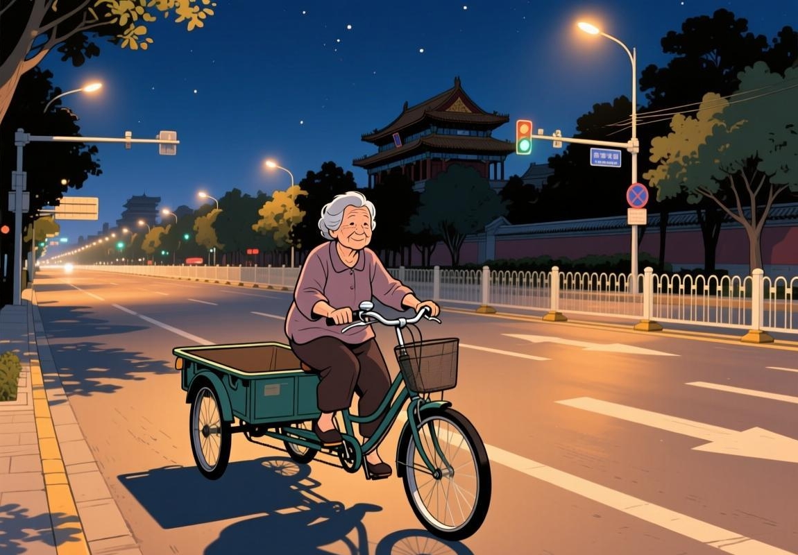 她快速地刷完牙、洗完脸,便蹬着她的三轮车,往相距一公里的儿子家赶去。三个小时后,这条街道定是一幅车水马龙的景象,街道两旁开始泛黄的银杏一定非常漂亮吧,但是此刻,她什么也看不到,空荡荡的大街,寂静而深邃的夜,唯有三轮车的声音和路灯下拉长的影子。