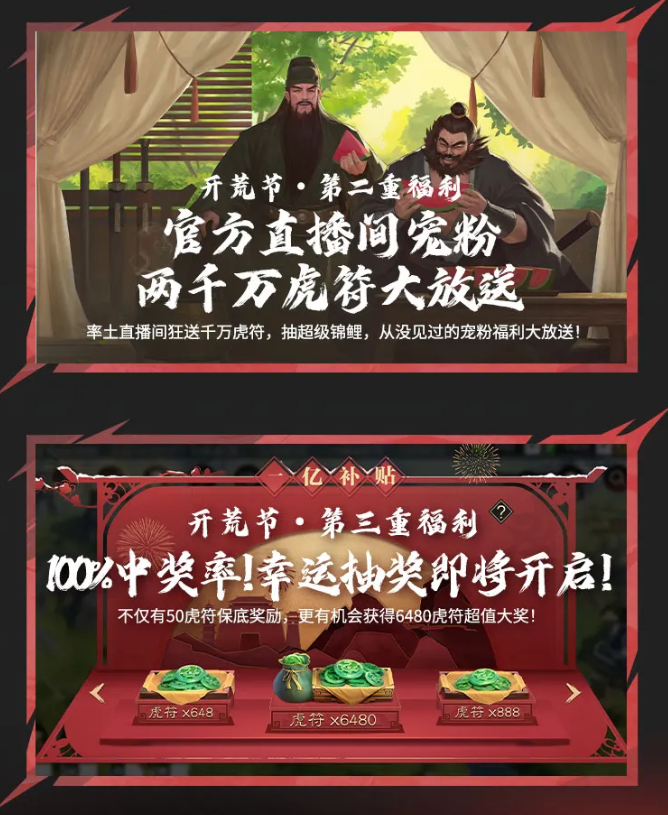 如果说第一重福利是开荒盛宴的开胃菜,那么接下来的双重好礼则是将这场盛宴推向高潮!官方将在直播间豪掷2000万虎符,并通过抽奖的形式送出史无前例的超级福利——“超级锦鲤”花落谁家,一起期待!