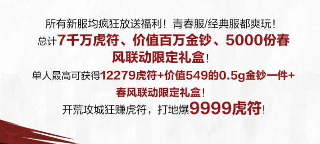 此次开荒节的福利主要分为三重。第一重福利聚焦于新服活动,无论是青春服还是经典服,玩家都能享受到前所未有的开荒体验。七千万虎符和百万金钞的巨额奖励等待瓜分,更有5000份春风联动限定礼盒等你来拿。单人最高可获得12279虎符、价值549元的0.5g金钞以及春风联动限定礼盒,福利强度直接拉满。更令人惊喜的是,玩家在开荒攻城掠地的过程中,不仅能积累虎符,甚至还有机会通过打地爆出9999虎符的超级大奖,让每一次征战都充满期待和惊喜。