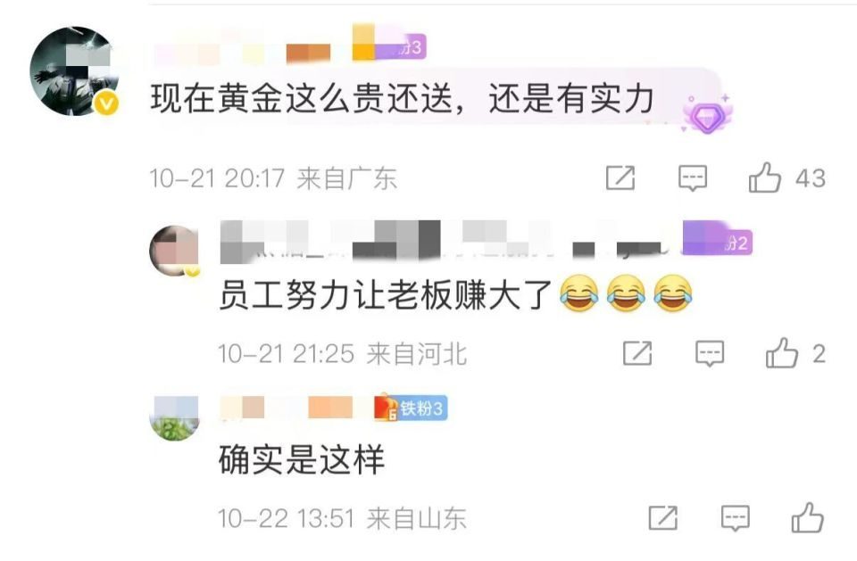 对此,有网友评论称“现在黄金这么贵还送,还是有实力”“员工努力让老板赚大了”“羡慕已经说累了”“这波福利诚意十足”......
