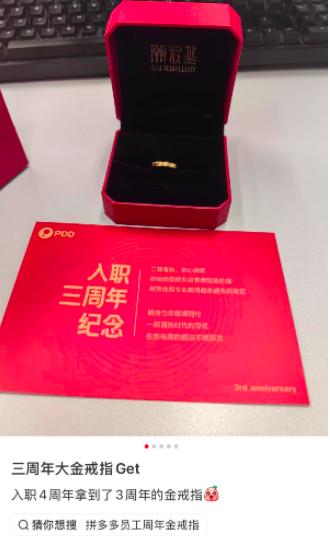 10月23日消息,近日,拼多多(PDD.US)向员工发放金戒指、“金鸡”等周年纪念礼,引发关注。