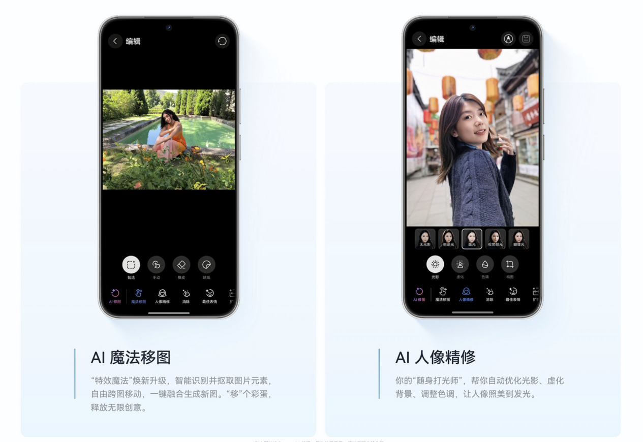 除了同档位领先的影像硬件与拍照模式,nova 14 活力版还通过搭载鸿蒙操作系统 5.1,再次提升了用户的拍照与修图体验。其中AI人像精修功能,可帮助用户自动优化光影、虚化背景、进一步提升人像照片的氛围感与质感;AI魔法移图功能,则能智能识别图片元素,让用户自由拖动、缩放和复制照片中的物体、人物等,轻松获得趣味性十足的创意照片。