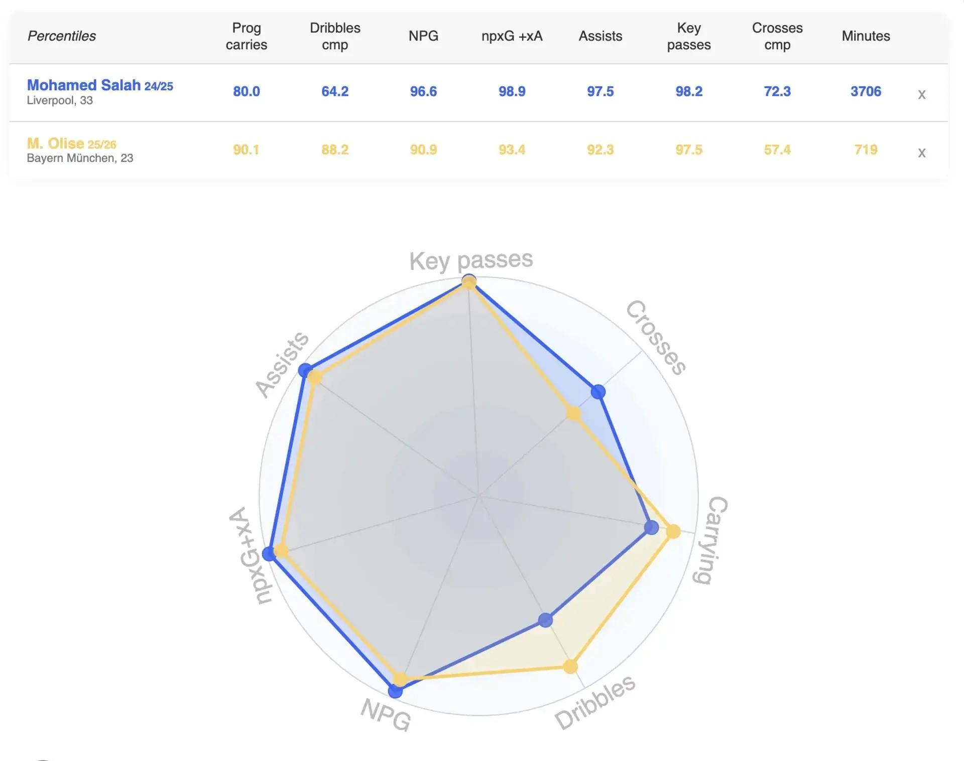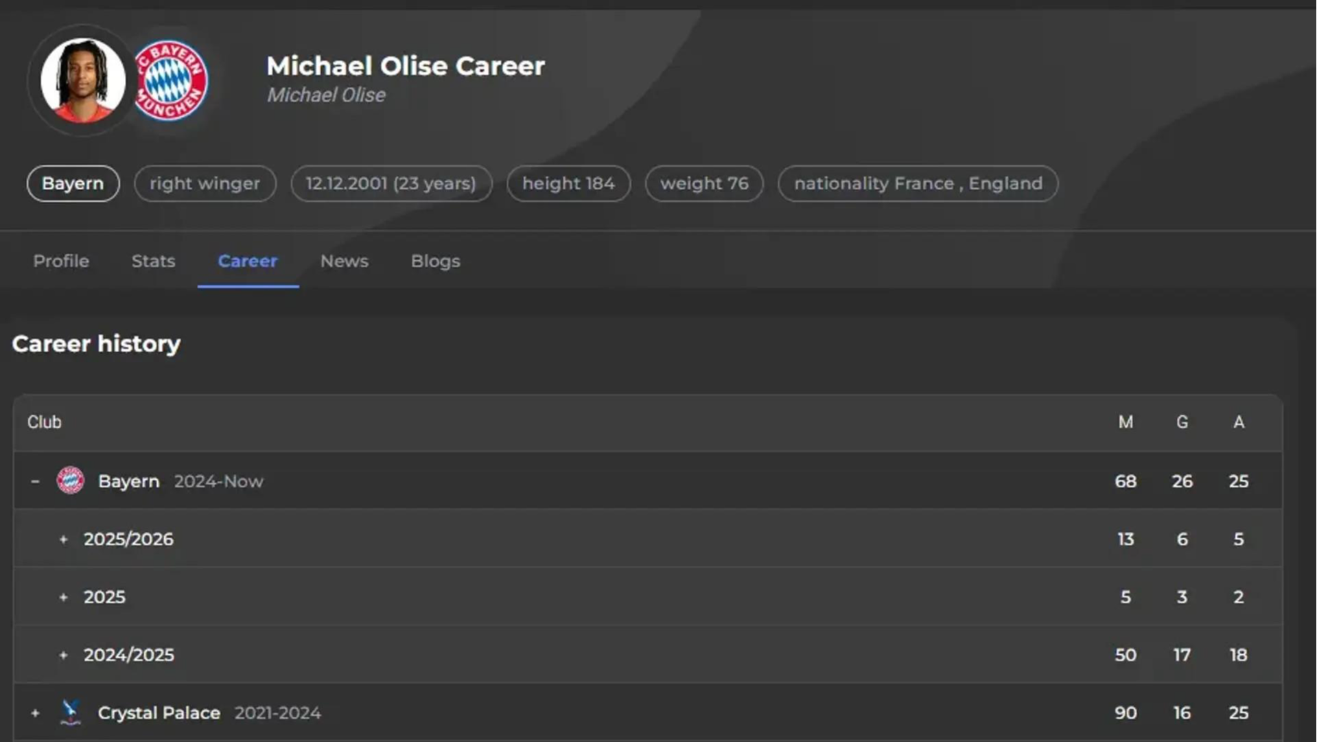 在拜仁效力的一年多时间里,奥利塞为球队出战68场,贡献26球30助攻。仅在2025/26赛季,他就已在13次出场中直接参与13粒进球。他的盘带能力极具观赏性,终结能力同样不容小觑。
