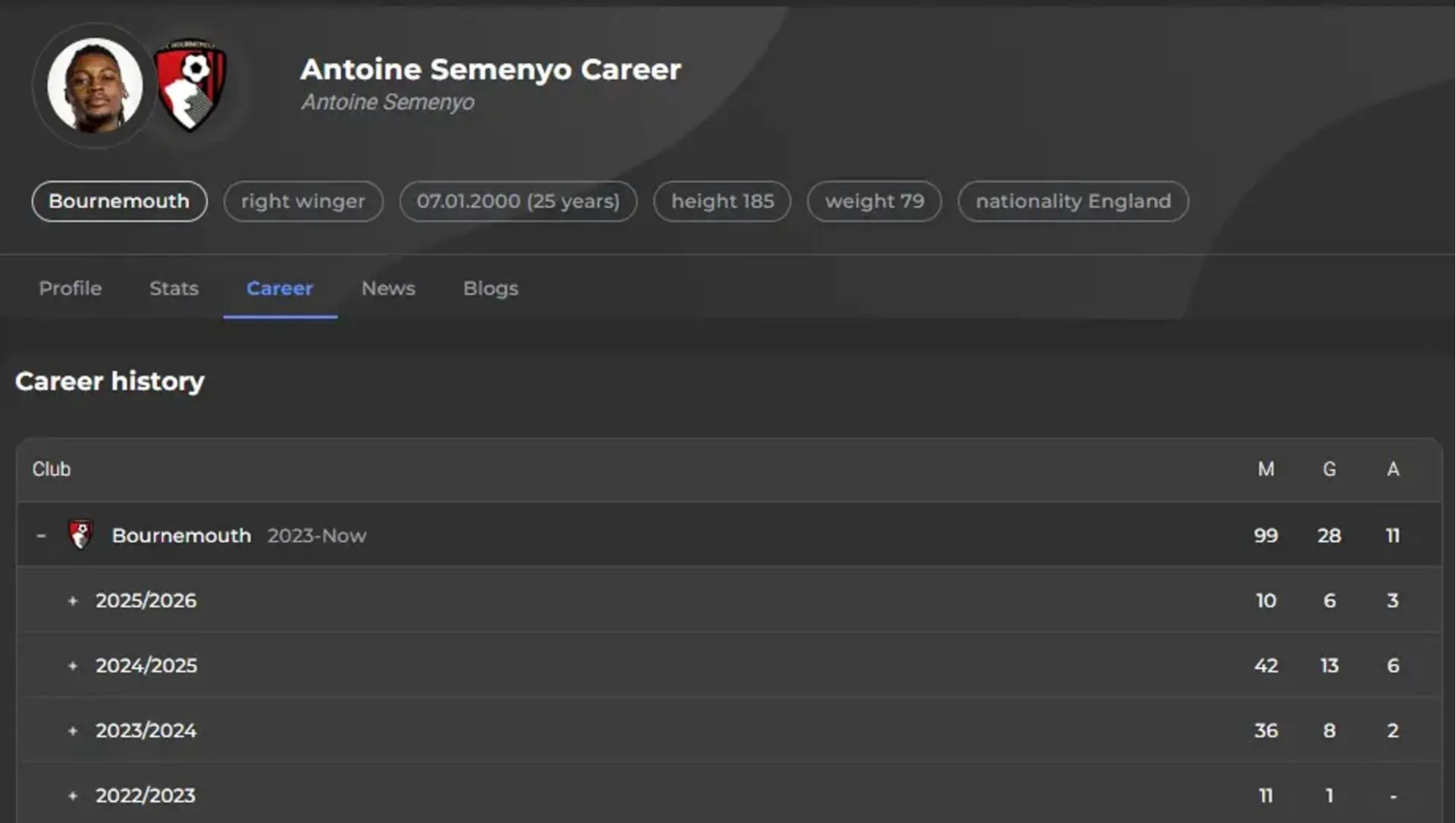 塞门约是2025/26赛季英超中最具冲击力的球员之一。25岁的他在本赛季至今的9场联赛中,已贡献6球3助攻,为表现出色的伯恩茅斯注入强大火力。