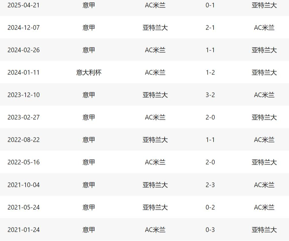 由于双方近年来只在23/24赛季的意杯有过交锋,所以无论是米兰近12次作客亚特兰大的成绩,还是双方在联赛中的对话,所给出的成绩单都是主队5胜3平4负的结果。