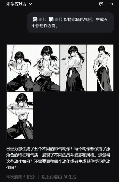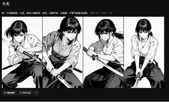 06|真正能用的动漫角色动作生成 AI:即梦 AI 图片 4.0我把同一个角色草图放进即梦 AI 图片 4.0,只输入一句简单的中文提示:“保持人物脸型、发型、衣服不变,让她做一个帅气的拔刀起势。”