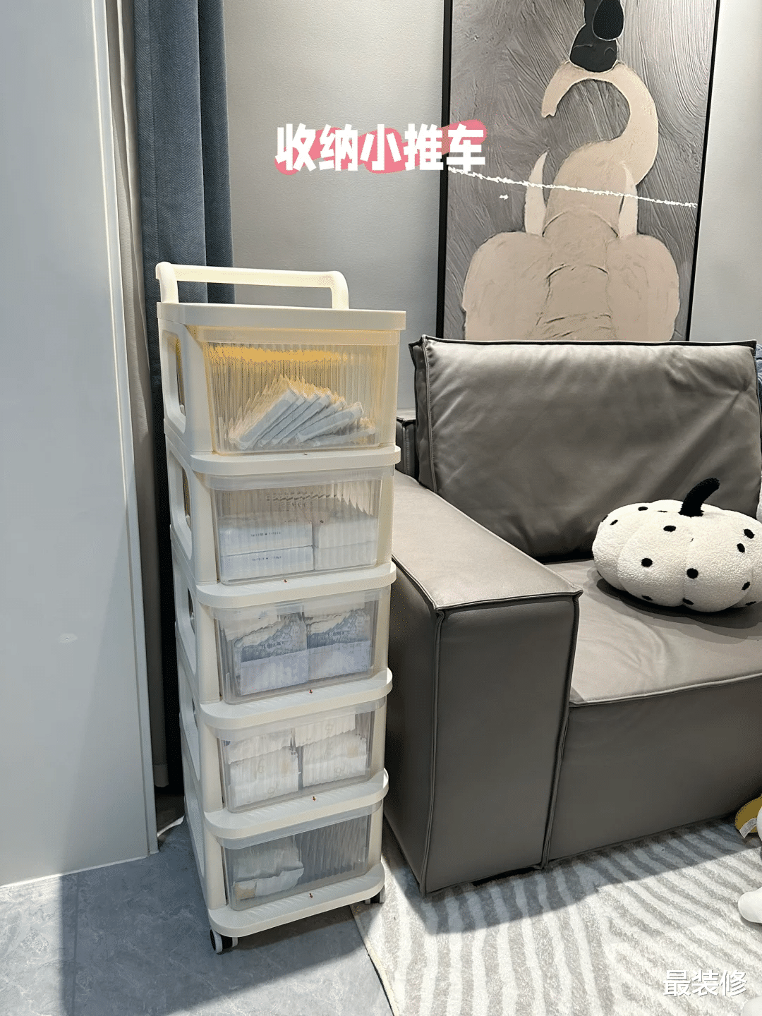 而且现在的年轻人,不光是会用这样现成的小边几,还会用推拉车改为小边几,上面放水杯,下面放一些零食,方便拿去,还不占地方。