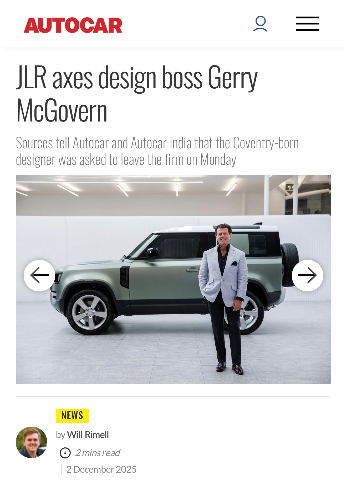 2025年12月3日消息,捷豹路虎首席创意官格里·麦戈文在公司任职21年后,于12月1日被突然解雇。