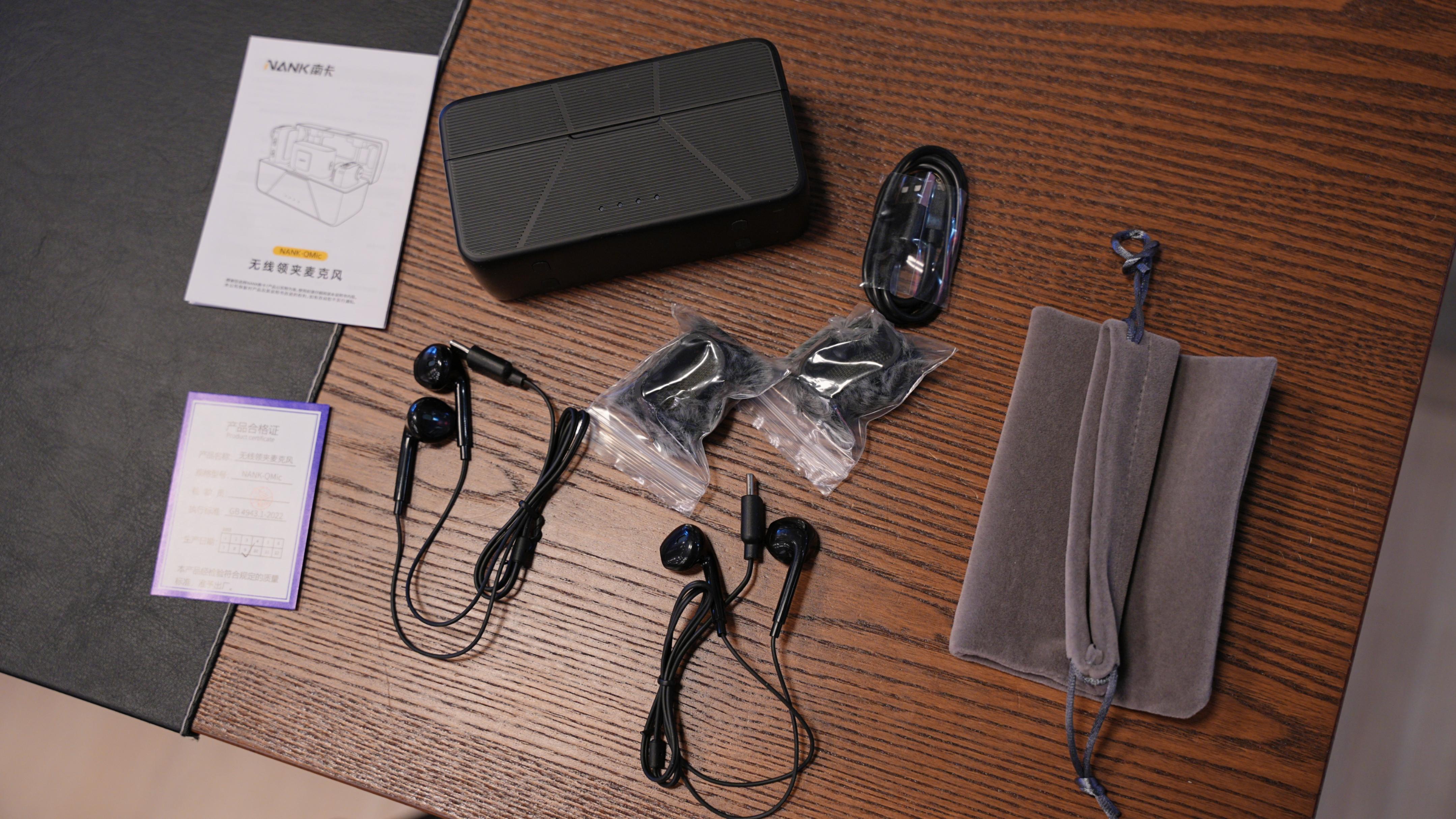 首先来给大家开箱,顺便给大家介绍一下开箱后的一些配件,还有它们的使用方法。分别是一个收纳袋,两个收音防风罩,一个充电线,两只耳返耳机。
