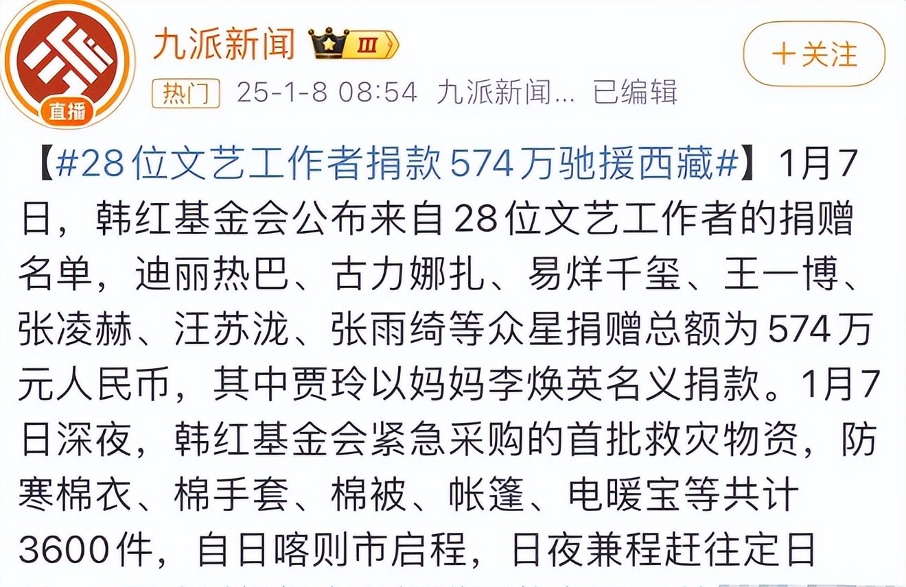 咱先说说明星捐款的事儿。韩红基金会公布了28位明星的捐款名单,总共574万。这数字看着不少,可仔细一琢磨,平均下来也就二十多万一人。这跟他们动辄几千万甚至上亿的年收入比起来,是不是有点……不够看?尤其是跟某些网红一比,更是显得有点寒酸。